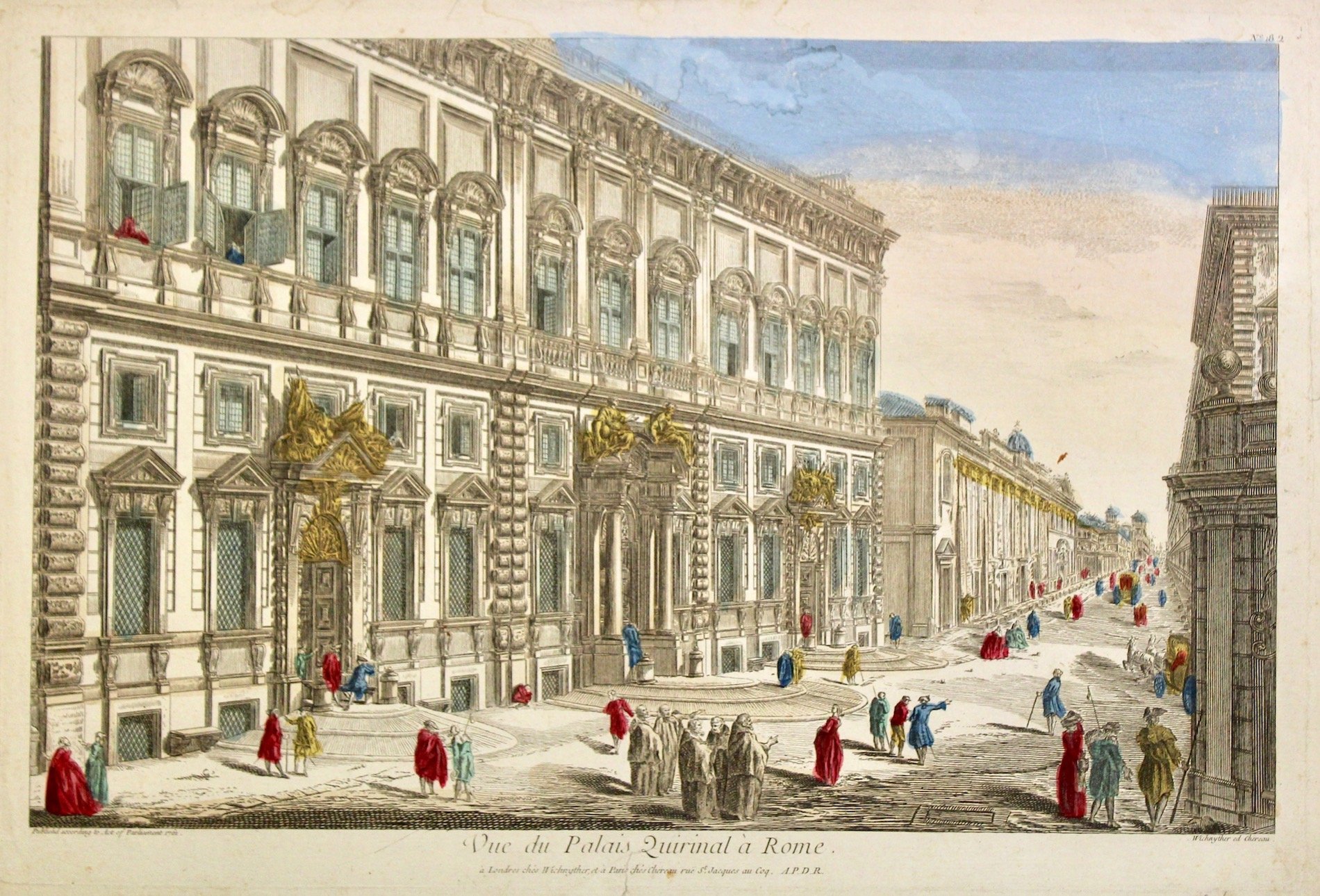 Incisione in rame mm 310x460, colorata a mano d’epoca. Fascinosa veduta ottica raffigurante il palazzo del Quirinale a Roma, con gente che passeggia. Bell’esemplare con qualche leggero alone in alto e vari restauri ai margini.