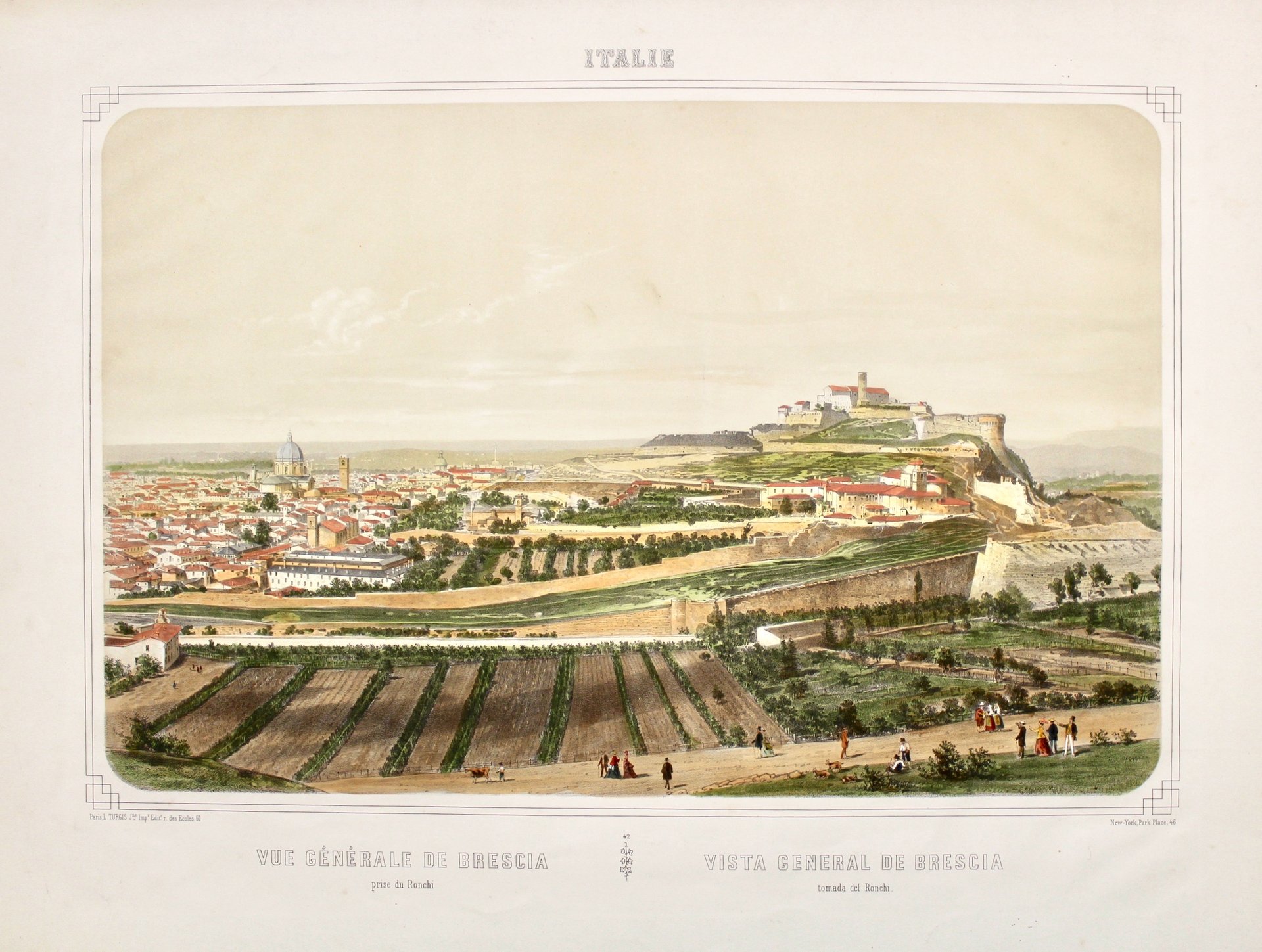 Litografia mm 310x480 su foglio 457x618, dipinta a mano. Splendida veduta generale colta sui Ronchi verso ovest con il duomo e la collina del Cidneo col castello in primo piano; dalla rara serie “Italie”. Splendido esemplare a pieni margini praticamente esente da difetti. Louis Auguste Turgis (Gouville dans la Manche, 1818 - Parigi, 1894) è stato un tipografo ed editore francese. Sono disponibili pochissime informazioni su questo personaggio, nonostante l'evidente influenza che ebbe sul commercio di stampe in Europa e a New York all'epoca. Suo padre era un commerciante di stampe a Parigi almeno dal 1828. Louis Le Jeune entrò nell'azienda intorno al 1856. Tra il 1851 e il 1874, l'azienda si dedicò quasi esclusivamente alle immagini religiose. Aveva laboratori a Parigi (rue des Écoles, 60), a Tolosa e una filiale a New York (78 Duane St.). La moglie rilevò l'attività (Maison Turgis) dopo la sua morte e fino alla seconda guerra mondiale. Nova-Fontanella, Piante e vedute a stampa di Brescia, XV-XIX secolo, pa, 220, scheda 108Lithograph mm 310x480 on sheet 457x618, hand-painted. Splendid general view taken of the Ronchi towards the west with the cathedral and the Cidneo hill with the castle in the foreground; from the rare series "Italie". Splendid example with full margins practically free of defects. Louis Auguste Turgis (Gouville dans la Manche, 1818 – Paris, 1894), was a French printer and publisher. Very little information is available on this individual despite the obvious influence he had on the print trade around Europe and in New York at the time. His father was a print merchant in Paris from at least 1828. Louis Le Jeune joined the business around 1856. Between 1851 and 1874, the business was dedicated almost exclusively to religious imagery. They had workshops in Paris (rue des Écoles, 60), in Toulouse and a branch in New York (78 Duane St.). His wife took over the business (Maison Turgis) after his death and up to the Second World War. Nova-Fontanella, Piante e vedute a stampa di Brescia, XV-XIX secolo, pa, 220, scheda 108
