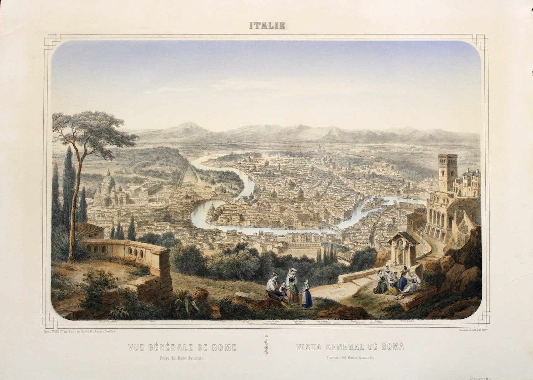 Litografia, mm 310x480, stampata a colori e rifinita a mano d'epoca. Splendida veduta panoramica. Ottimo esemplare a pieni margini con piccola traccia di piega nell'angolo sup. sin. al margine. Isidore Laurent Deroy fu acquarellista, pittore e litografo francese allievo di Félix e del pittore Cassas. Insieme a Andrè Chapuy fu autore di numerose serie di vedute di città, fra cui questa pubblicata dall'editore Turgis sia a Parigi che a New York. Litograph, mm 310x480, printed in colour and originally finished by hand, good example with a light fold in upper left corner. <BR>