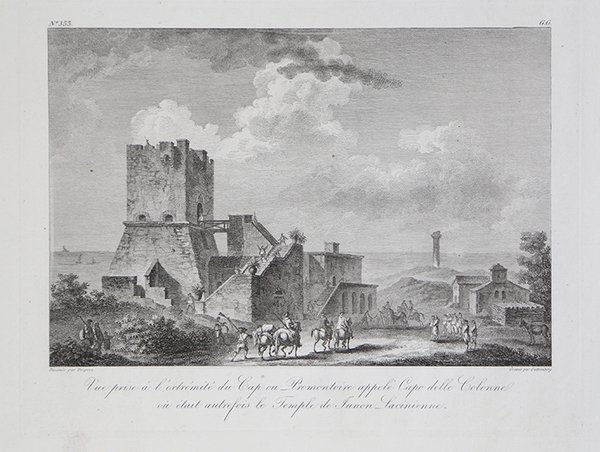 Veduta pubblicata nel ' Voyage Pittoresque ou description des Royaumes de Naples et de Sicile, opera in 5 volumi per la prima volta stampati a Parigi tra 1781 e il 1786. Richard de Saint-Non conobbe, durante il suo viaggio a Roma, i due già celebri pittori francesi Jean Honoré Fragonard e Hubert Robert, con i quali prosegue il suo viaggio per tutto il paese. Da questa grande amicizia nasce l’idea e la collaborazione per l’ambizioso progetto di documentare graficamente tutti i principali monumenti dell’Italia Meridionale e della Sicilia. Da qui, tra il 1781 ed il 1786, con l’aiuto di numerosi ed importanti architetti, pittori ed incisori, venne alla luce il Voyage Pittoresque ou description des Royaume de Naples et de Sicilie, opera composta di cinque volumi che uscirono annualmente. Incredibile sforzo tipografico, l’opera raccoglie quasi per intero gli appunti di viaggio del Saint-Non, adeguatamente assemblati e corretti; il corpus grafico è composto di ben 542 incisioni all’acquaforte e bulino, opera dei principali artisti di riproduzione del periodo. Da un punto di vista editoriale l’iniziativa riscuote immediatamente un grandissimo successo: il libro diviene un vero e proprio modello tipografico, sul quale sono basate diverse pubblicazioni dell’impero napoleonico. Dal punto di vista artistico le vedute, i paesaggi e le rovine conservano, e non può essere altrimenti, lo stile pittorico e romantico del Fragonard, del Robert, del Desprez, e di tutti gli altri artisti che collaborano nella realizzazione di questa monumentale opera. Il notevole successo commerciale della raccolta è testimoniato dalla ristampa, tra il 1795 ed il 1798, delle sole tavole pittoriche. Un’ulteriore edizione è stampata nel 1829 dal Dufour. Esemplare tratto dal ' Voyage Pittoresque, edizione del 1829. ' Acquaforte, stampata su carta vergata coeva, leggere ossidazioni, per il resto in ottimo stato di conservazione. View taken from the Voyage Pittoresque ou description des Royaume de Naples et de Sicilie by Richard de Saint-Non. During his trip to Rome, Richard de Saint-Non met two already famous French painters, Jean Honoré Fragonard and Hubert Robert, with whom he travelled along Italy. Their friendship led to the cooperation for the ambitious project of depicting all the main monuments of Southern Italy and Sicily. Between 1781 and 1786, with the assistance of many contemporary artists, he realized the Voyage Pittoresque ou description des Royaume de Naples et de Sicilie, a five volumes work published annually. As a result of a great typographical effort, the work is a collection of Sain-Non’s travelling notes; the graphic part is made up of 542 engravings and etchings, realized by the most important artists of the period. The work is immediately successful, for the book became a new typographical model for the following publications. From an artistic point of view, the views, landscapes and antiquity keep the Romantic pictorial style of Fragonard, Robert, Desprez and all the other artists that took part in this monumental project. The re-issue, between 1795 and 1798, of the pictorial plates, witnesses the great success of this project. A re-issue of the whole work was edited in 1829 by Dufour. Example taken from the edition of 1829. ' Etching, printed on contemporary laid paper, light foxing, otherwise good condition. Cfr.