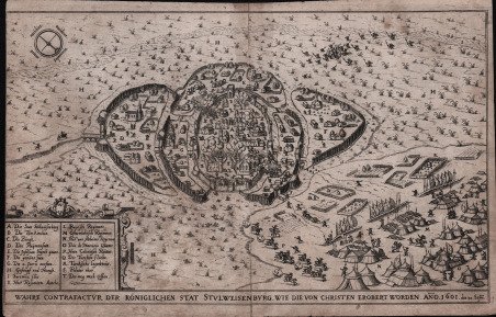 Veduta di ' Székesfehérvár, ' di Hieronymus Ortelius e Johann Sibmacher, tratta dalla ' Chronologia oder historische Beschreibung aller Kriegsempörungen unnd Belägerungen der Stätt und Vestungen auch Scharmützeln und Schlachten so in Ober und Unter Ungern auch Siebenbürgen mit dem Turcken von Ao. 1395 biss auff gegenwertige Zeit denckhwürtig geschehen. Norimberga, Christoff Lochner per Johann Sibmacher, 1604. Importante opera storica sulla storia militare della regione austro-ungarica, inclusa la Transilvania, durante gli anni 1395 -1612, che descrive tutte le guerre, gli assedi di città e fortezze, le battaglie con i turchi e altri eventi degni di nota in Ungheria, scritta e assiduamente registrata da Hieronymus Ortelius o Oertel (1543-1614). "Una descrizione di tutte le battaglie che ebbero luogo in Ungheria e Transilvania durante le guerre con i Turchi dal 1390 al 1602" (Atabey), particolarmente preziosa per le sue vedute delle città ungheresi sotto assedio o in battaglia e i ritratti dei comandanti militari. L'autore, notaio alla corte imperiale, fu incoraggiato a scrivere l'opera da suo cognato, Johann Sibmacher, incisore ed editore di Norimberga, responsabile anche delle tavole incise: "uno storico che difendeva i diritti dei protestanti minacciati dall'imperatore Rodolfo II, si rifugiò a Norimberga dove pubblicò questa storia dell'Ungheria" (Atabey). Niente di simile era mai stato stampato prima. Specialmente il periodo 1592-1612 è trattato in modo molto dettagliato, dato che l'autore ha incluso rapporti di testimoni oculari sulle invasioni turche nella regione. Le 30 tavole a doppia pagina mostrano gli assedi e le fortificazioni delle seguenti città: Vienna, Zolnoch, Tocaky, Guyla, Zigeth, Sysegk, Palotta, Villeck, Raab, Comorra, Gran, Vizzegrad, Tergovist, Temeswar, Hatwan, Petrina, Tottis, Papa, Waitzen, Budapest, Tolna, Stulweisenburg e Canisha. Le città furono assediate dai turchi o le città turche dai cristiani. Incisione in rame, stampata su carta vergata contemporanea, irregolarmente rifilata al bordo, ossidazione uniforme e qualche macchia, altrimenti buono stato di conservazione. Rara. Bibliografia Leonora Navari ' The Ottoman world. The Sefik E. Atabey Collection. Books, manuscripts and maps., n. 882. Siege-view of Székesfehérvár, by Hieronymus Ortelius and Johann Sibmacher taken from the ' Chronologia oder historische Beschreibung aller Kriegsempörungen unnd Belägerungen der Stätt und Vestungen auch Scharmützeln und Schlachten so in Ober und Unter Ungern auch Siebenbürgen mit dem Turcken von Ao. 1395 biss auff gegenwertige Zeit denckhwürtig geschehen. Nuremberg, Christoff Lochner for Johann Sibmacher, 1604. Important historical work on the military history of the Austro-Hungarian region, including Transylvania, during the years 1395 -1612, describing all the wars, sieges of cities and fortresses, battles with the Turks and other noteworthy events in Hungary, written and assiduously recorded by Hieronymus Ortelius or Oertel (1543-1614). "A description of all the battles which took place in Hungary and Transylvania during the wars with the Turks from 1390 to 1602" (Atabey), especially valuable for its views of Hungarian towns under siege or battle and the portraits of military commanders. The author, a notary at the imperial court, was encouraged to write the work by his brother-in-law, Johann Sibmacher, a Nuremberg engraver and publisher, who was also responsible for the engraved plates: "a historian who defended the rights of Protestants threatened by the emperor Rudolph II, took refuge in Nuremberg where he published this history of Hungary" (Atabey). Nothing like this was ever printed before. Especially the period 1592-1612 is treated in great detail since the author included eyewitness reports on the Turkish invasions in the region. The 30 double-page plates show the sieges and the fortifications of the following cities: Vienna, Zolnoch, Tocaky, Guyla, Zigeth, Sysegk, Palotta, Villeck, Raab, Comorra, Gran, Vizzegrad, Tergovist, Temeswar, Hatwan, Petrina, Tottis, Papa, Waitzen, Budapest, Tolna, Stulweisenburg and Canisha. The cities were either besieged by the Turkss or the Turkish cities by the Christians. Copperplate, printed on contemporary laid paper, irregularely trimmed at the borderline, uniform oxidation and some spot, otherwise good condition. Rare. Bibliografia Leonora Navari ' The Ottoman world. The Sefik E. Atabey Collection. Books, manuscripts and maps., n. 882. Cfr.