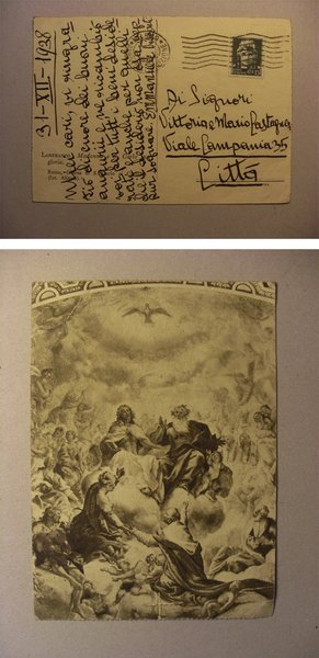 Cartolina manoscritta e firmata EMANUELE VISCONTI (scrittore) 1938 "Lanfranco - Madonna e S.Carlo in Gloria"