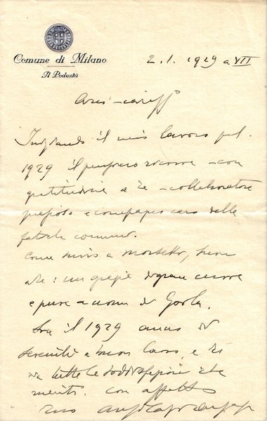 Note: lettera manoscritta e firmata di Giuseppe De Capitani D'Arzago di 1 facciata datata 2 Gennaio 1929 su carta intestata "Comune di Milano, il Podestà"; ottimo es.