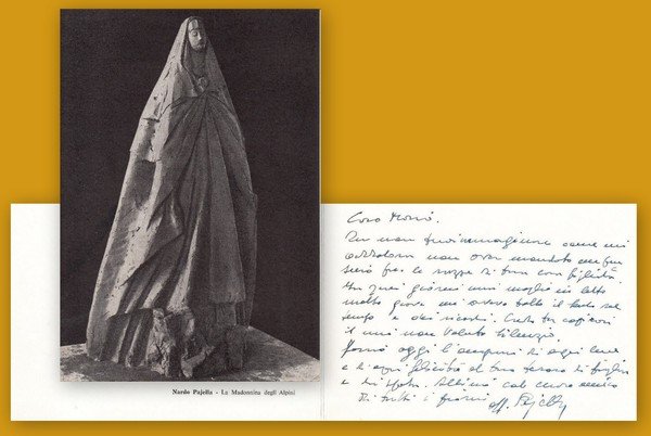Note: biglietto di 4 facciate manoscritto e firmato da Nardo Pajella riproducente una sua scultura; biglietto di scuse e di auguri tardivi per nozze; il biglietto è datato 12 agosto 1957; ottimo es.