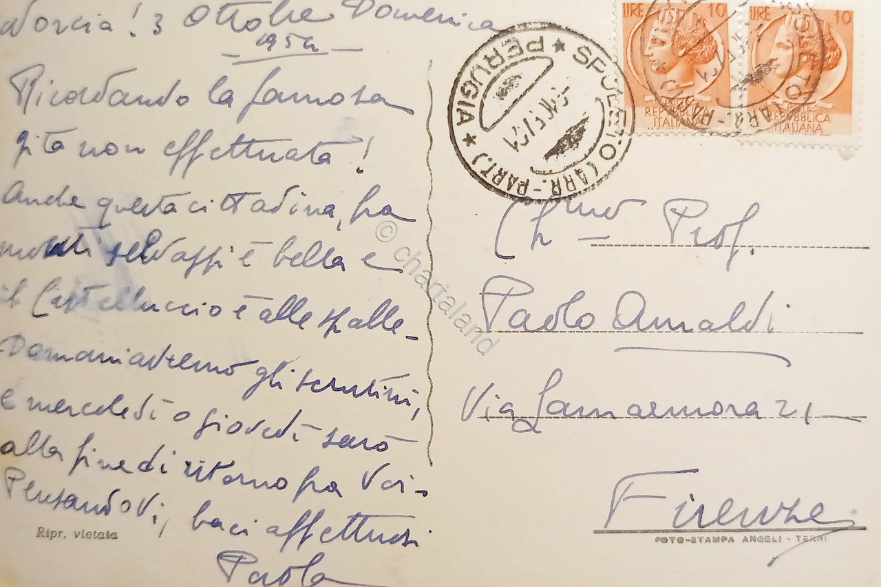 Cartolina - Norcia - Piazza S. Benedetto e Castello Vignola - 1954