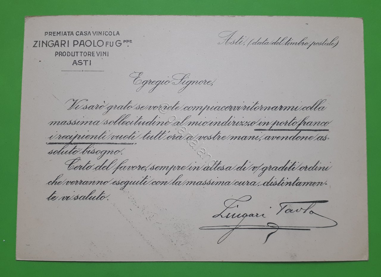 Cartolina - Premiata Casa Vinicola - Zingari Paolo fu G-pre. - Asti - 1950 ca.