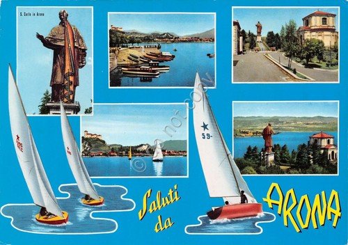 Cartolina Arona vedute varie e Statua S. Carlo (Novara)