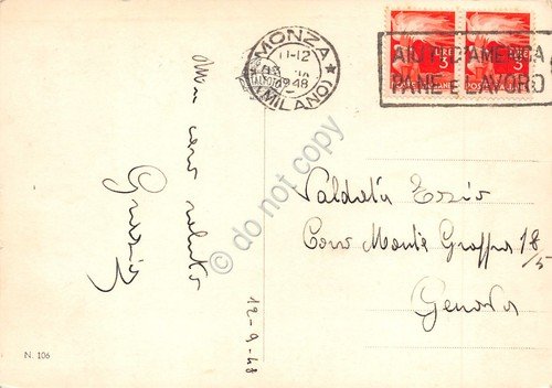 Cartolina Monza Arengario timbro a targhetta Aiuti d'America pane e lavoro 1948