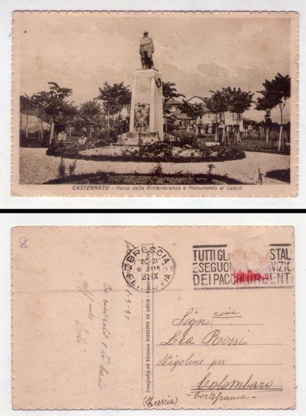 Cartolina/postcard CASTEGNATO (Brescia) Parco della Rimembranza e Monumento ai Caduti. 1931