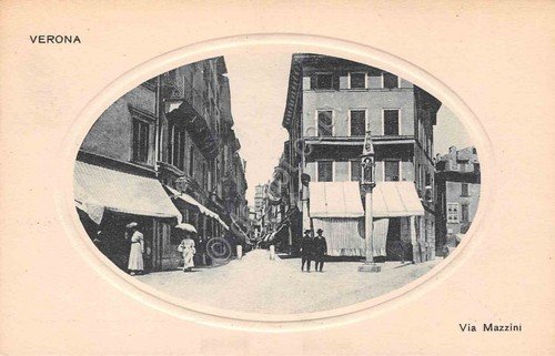 Cartolina Verona Via Mazzini animata con ovale in rilevo