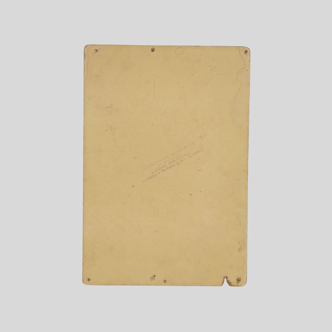 Fotografia all’albumina formato “Salon”, mm 214×154 (fotografia), mm 246×170(supporto). Al recto didascalia a inchiostro: «Larizza. Cavalleria rusticana», al verso è presente il timbro del fotografo «Fotografia Guglielmi. Condotta da Luigi Gavioli. Via Farini n. 20. Ravenna». Tracce d’uso alla fotografia e al supporto, alcuni buchetti marginali, mancanza al margine inferiore. Raro ritratto fotografico del tenore napoletano Vincenzo Larizza in abiti di scena da: “Cavalleria rusticana”. Fu molto apprezzato in Italia e all’estero, scomparve prematuramente nel 1902.