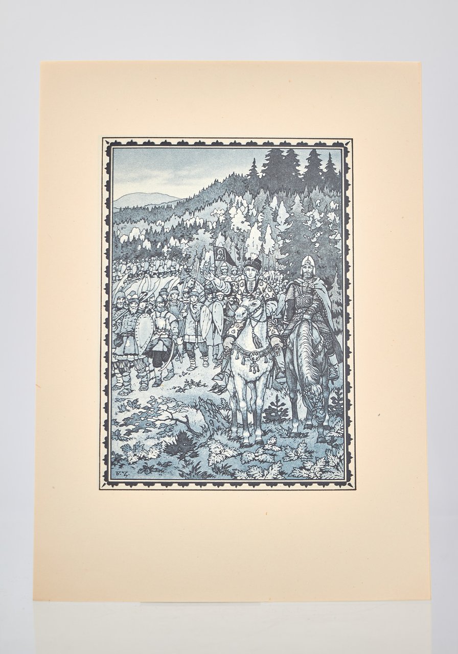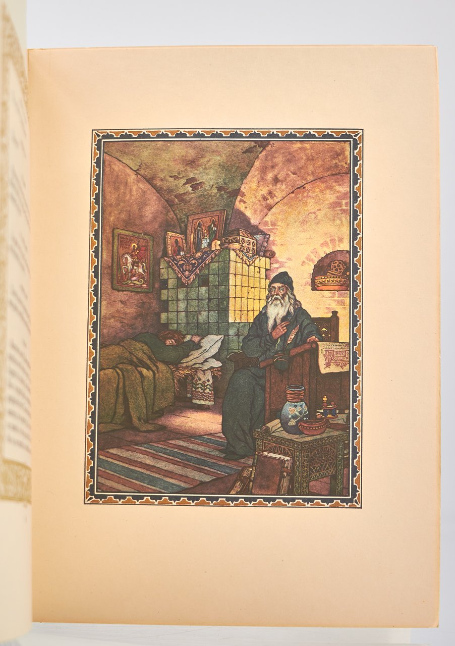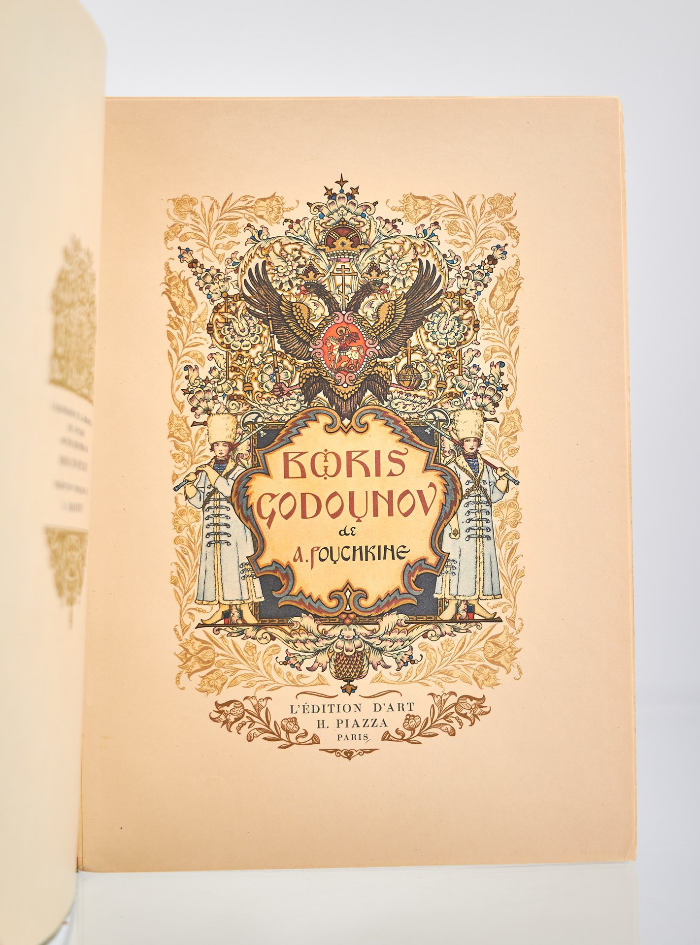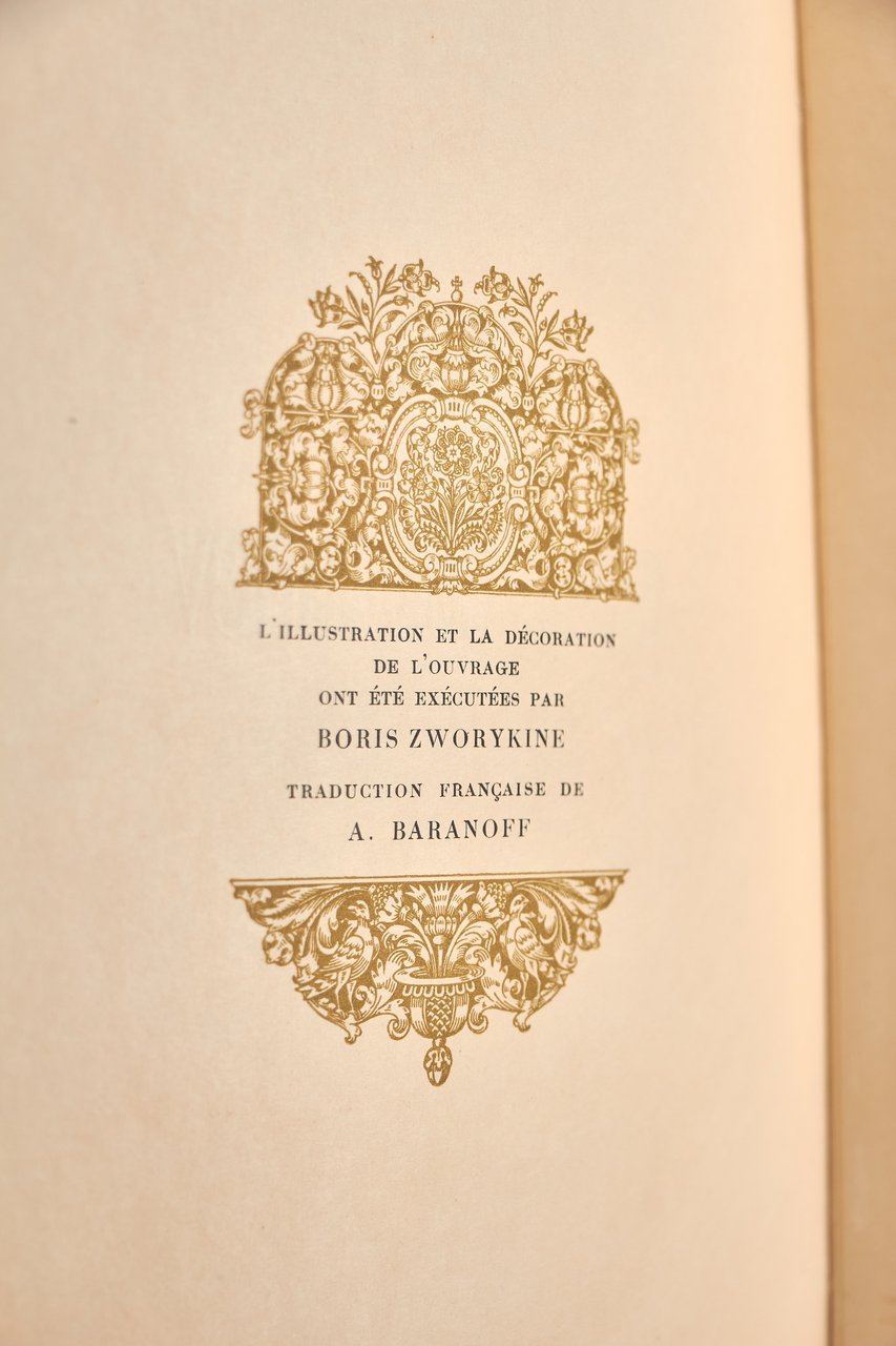 L'Edition d'art H. Piazza | Paris 1927 | 17 x 24 cm | broché sous étui | Edition illustrated with 15 original compositions colored in stencil by Boris Zworykine, one of 145 numbered copies on imperial japan paper, complete with its suite in black, the deluxe copies (tirage de tête) after 35 other Imperial Japan containing a double suite and a watercolor. Spine very slightly lightened, corners of the chemise slightly dull, beautiful copy. The cover, frames, headers and cul-de-lampes are also by Boris Zworykine. * [FRENCH VERSION FOLLOWS] | Edition illustrée de 15 compositions originales coloriées au pochoir de Boris Zworykine, un des 145 exemplaires numérotés sur Japon impérial, bien complet de sa suite en noir, tirage de tête après 35 autres Japon impérial contenant une double suite et une aquarelle. Dos très légèrement éclairci sans gravité, coins de l'étui légèrement émoussés, bel exemplaire. La couverture, les encadrements, les en-têtes et les culs-de-lampe, sont également de Boris Zworykine.