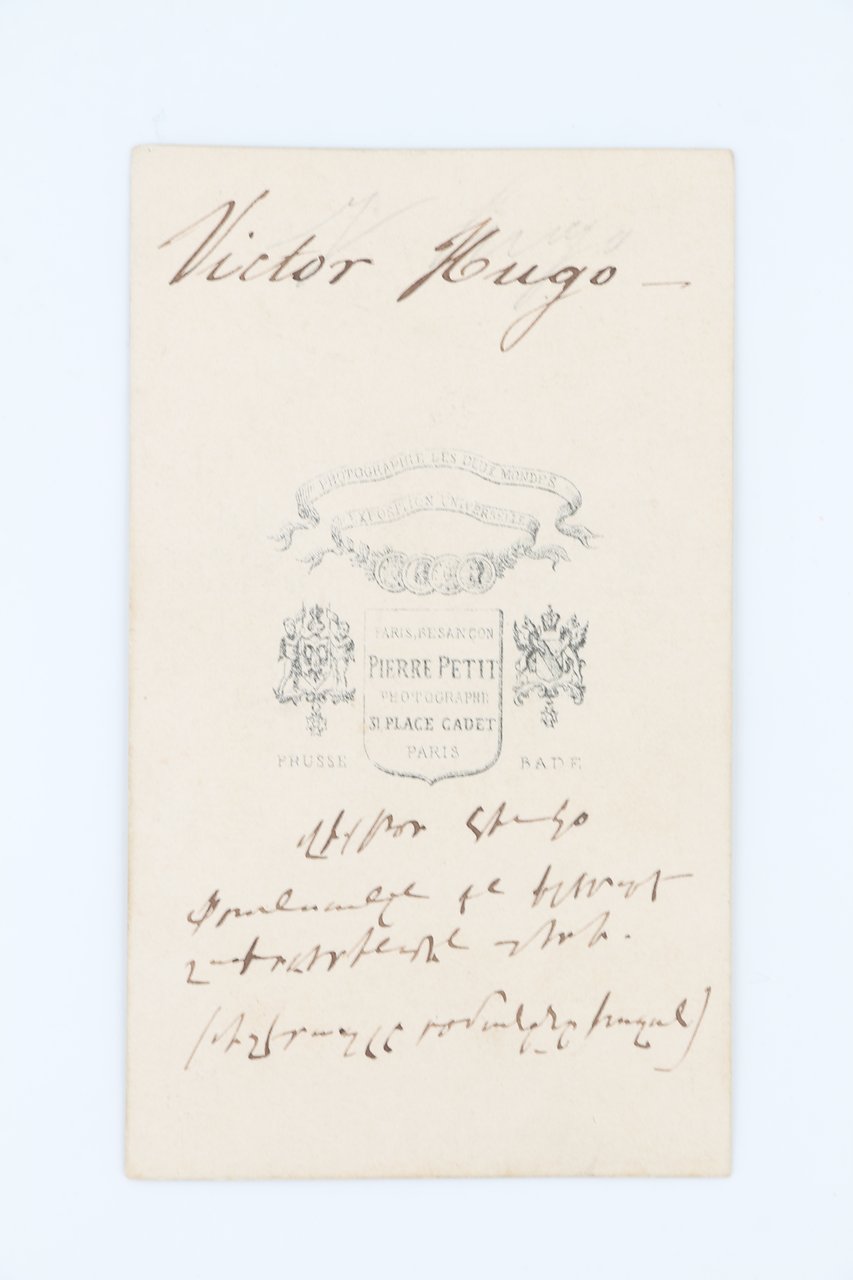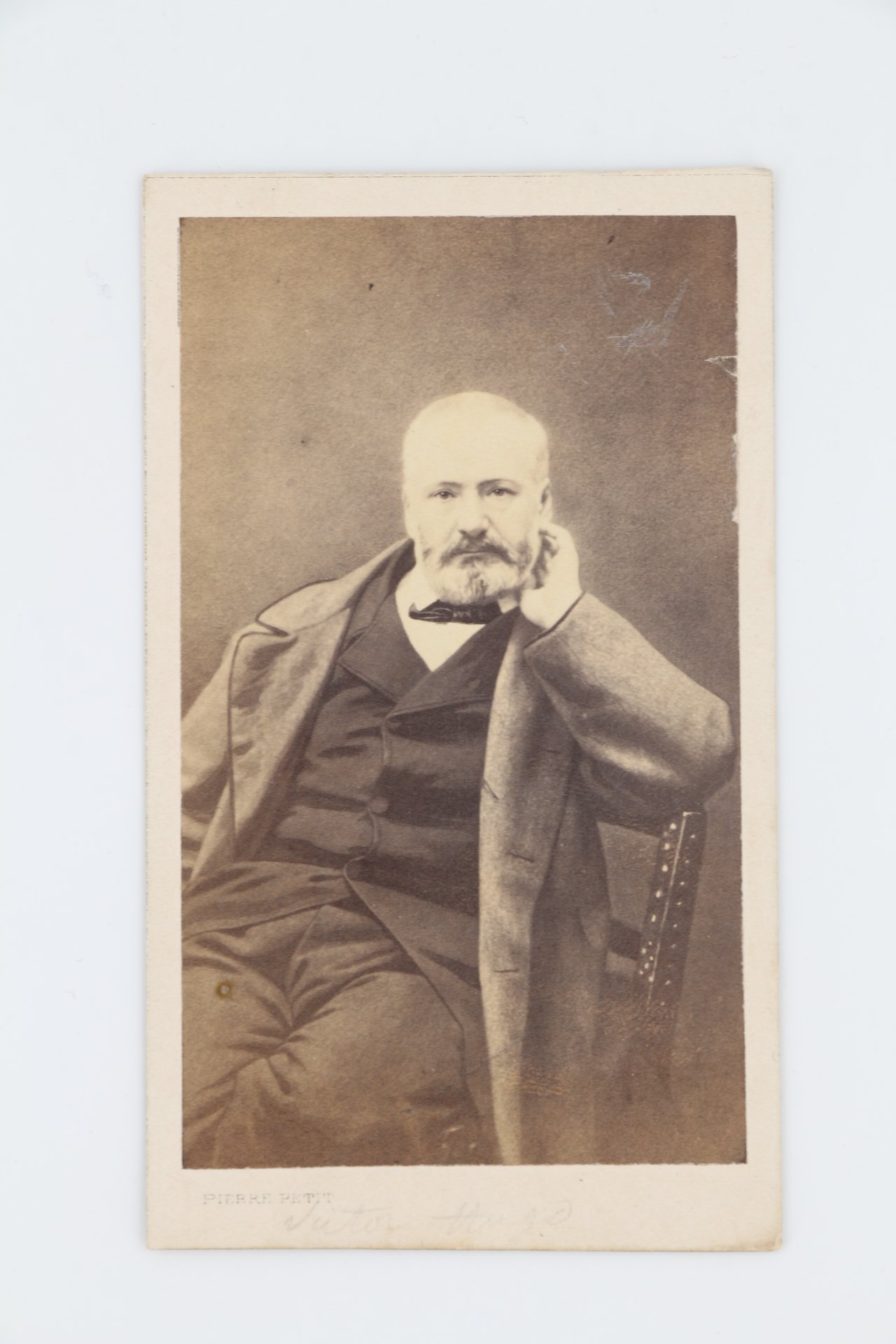 - Pierre Petit, Paris s.d. (1861), 6,2x10,2cm, une photographie contrecollée sur carton. - Photographie originale imprimée sur papier albuminé et contrecollée sur carton. Annotations manuscrites au dos. Toute première photographie de Victor Hugo barbu. C'est en janvier 1861, à la suite d'un violent mal de gorge, que l'écrivain décide de se laisser pousser la barbe?: «?Je laisse pousser ma barbe pour voir si cela me protégera contre les maux de gorge?». On trouve plusieurs occurrences à la célèbre barbe dans la correspondance de Victor Hugo?: Conclusion?: il faut qu'une tête d'homme soit bien belle, bien modelée par l'intelligence et bien illuminée par la pensée, pour être belle sans barbe ; il faut qu'une face humaine soit bien laide, bien irrémédiablement déformée et dégradée par les idées étroites de la vie vulgaire, pour être laide avec la barbe. Donc, laissez croître vos barbes, vous tous qui êtes laids, et qui voudriez être beaux?!?» (lettre à un destinataire inconnu, 1845) Outre l'aspect esthétique de cette métamorphose, il s'agit d'un véritable pied de nez au pouvoir impérial qui avait décrété l'interdiction de la barbe dans le corps enseignant. [ENGLISH DESCRIPTION ON DEMAND]