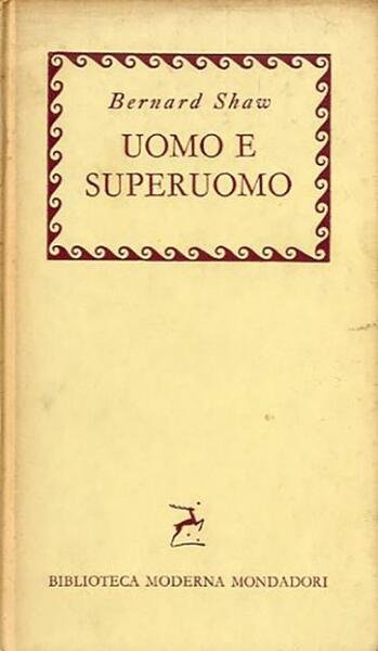 267 p. ; 19 x 11 cm. Biblioteca moderna Mondadori, 47. Sezione Teatro, 4. È una commedia ispirata alle idee filosofiche di Friedrich Nietzsche circa il superuomo (Übermensch), da cui l'opera prende il nome. La prima di «Uomo e Superuomo» venne rappresentata presso il Royal Court Theatre di Londra, il 23 maggio 1905, durante la quale non fu però messo in scena l'atto terzo, noto altrimenti come «Don Giovanni all'Inferno» («Don Juan in Hell»). La seconda messa in scena di tale atto fu proposta in teatro solo due anni più tardi, il 4 giugno 1907, sempre al Royal Court di Londra. La scelta d'una simile divisione deve al peculiare carattere della parte originariamente esclusa della commedia, in cui si abbandonano le coordinate terrene dei precedenti due atti e i personaggi vengono a trovarsi nel regno degl'Inferi, teatralmente rappresentato dalle ombre vespertine d'un luogo immaginario nella Sierra Nevada. Titolo originale dell'opera: «Man and superman». Unica traduzione autorizzata dall'inglese di Paola Ojetti. . Legatura editoriale, coperta in cartone rigido con titolo impresso al dorso e al piatto. Segni del tempo ai risvolti della coperta, al dorso (imbrunimento) e al taglio (ingiallimento della carta), per il resto esemplare integro. Codice libreria 6405.
