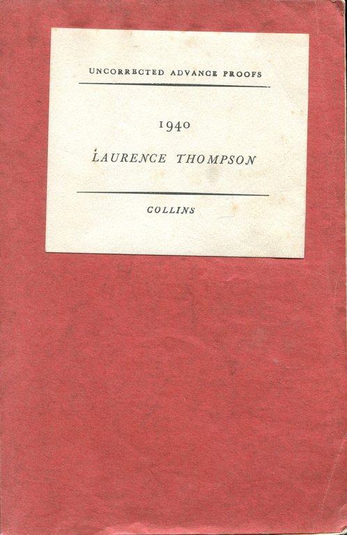 No marks or inscriptions. Minor creasing to corners of front cover, crease to spine. A very clean very tight copy with bright unmarked boards, slightly dusty page edges and no bumping to corners. 243pp. An account of a memorable year - 1940 - based on information gathered from a wide range of sources by journalist Laurence Thompson. Uncorrected Advance Proof copy.