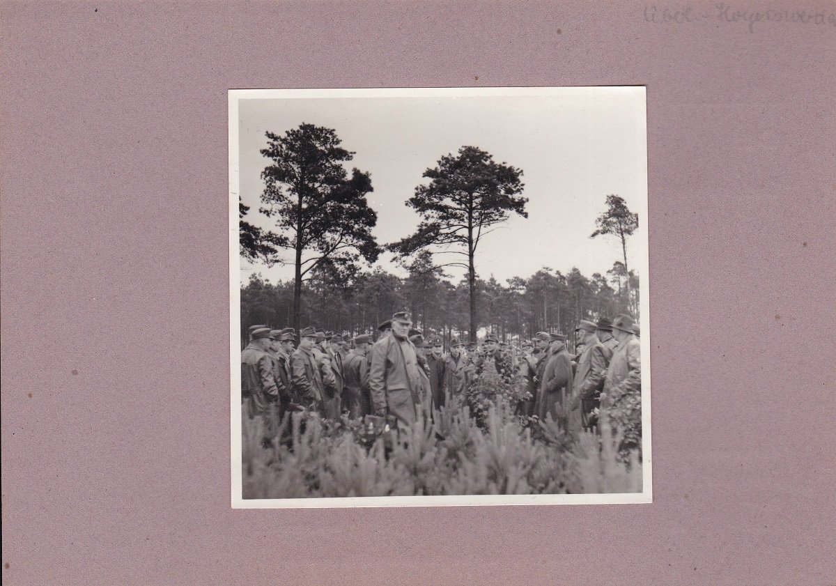 Die fünf Photographien zeigen Ansichten aus Waldgebieten und mit zahlreichen Personen, vermutlich handelt es sich hierbei um den Aufgaben des Instituts zugehörige Personen. Drei Aufnahmen sind mit "Überl.-Hoyerswerda" beschriftet, die anderen zwei mit "Überl.-Wessau" (soweit erkennbar). Möglicherweise handelt es sich bei dem ersten Wort um "Überläufer" und die Aufnahmen stammen sogar noch aus den Jahren vor 1945. Die Bekleidung der Forstleute auf den Bildern (lange Mäntel) könnte dem durchaus entsprechen. Die Beschriftungen der Rückseiten des Trägerkartons verweisen auf das Institut für forstliche Bodenkunde, Ziffernfolgen am Rand lassen das Jahr 1953 annehmen. Hier sind Numerierung und Negativnummer angegeben. Vermutlich handelt es sich um Photographien aus der frühen DDR, ab 1951 stand das Institut unter Leitung des Bodenkundlers Ernst Ehwald.