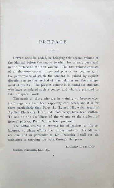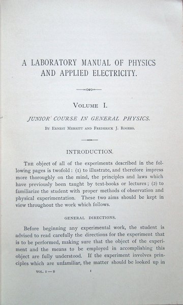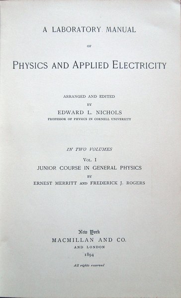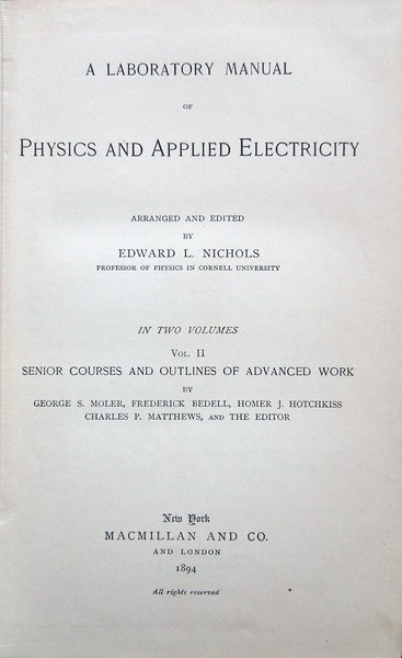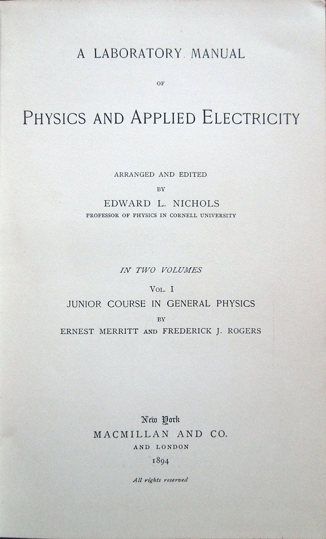 A Laboratory Manual of Physics and Applied Electricity, arranged and edited by Edward L. Nichols . in Two Volumes. Vol. I. Junior Course in General Physics - Vol. II. Senior Courses and Outlines of Advanced Work