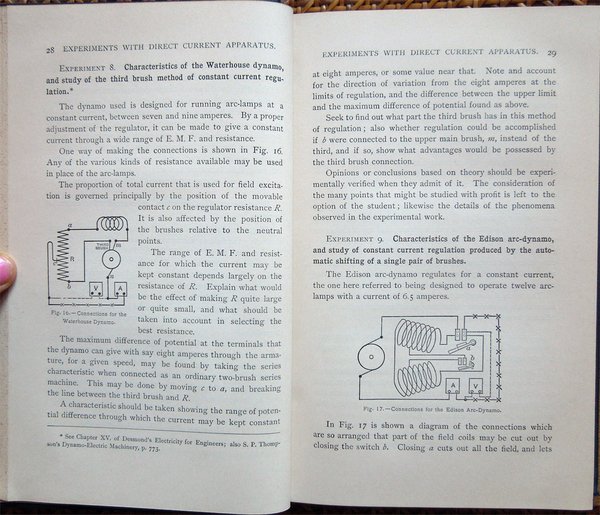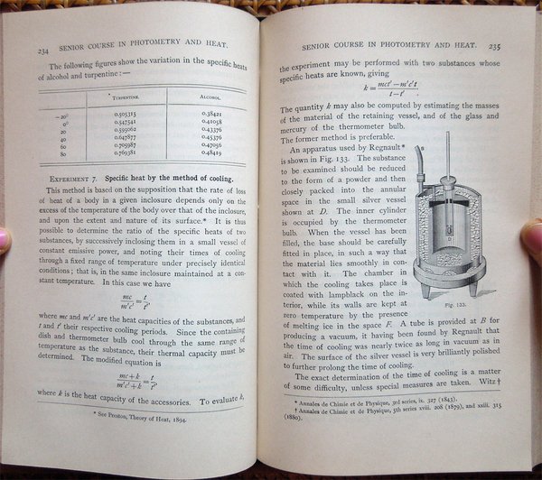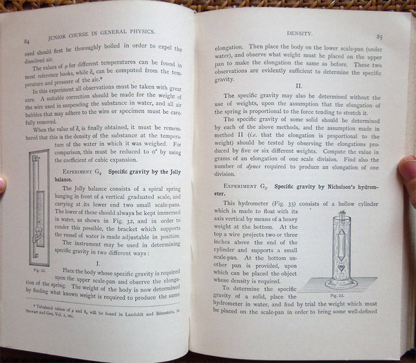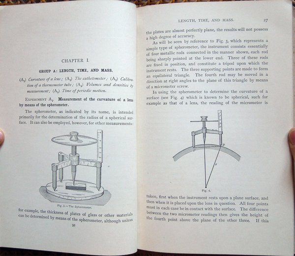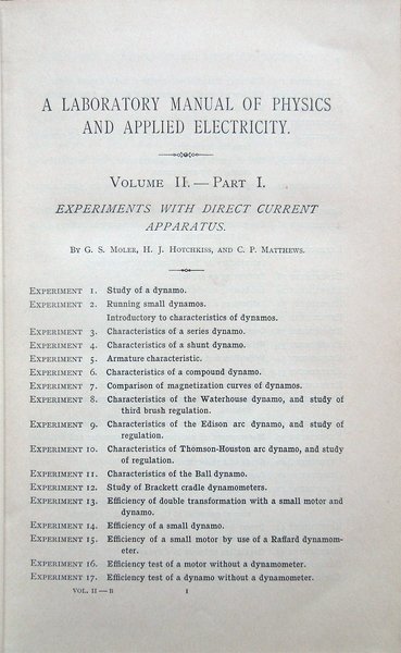 Due volumi in-8° (21,3 x 13,3 cm), pp. (2), XIV, 294; VII, (1), 444, legatura editoriale, con titoli al dorso, con normali segni del tempo. Con due tavole fuori testo, più volte ripiegate, e 108 figure in bianco e nero nel testo, al volume primo e due tavole fuori testo, più volte ripiegate, e 245 figure in bianco e nero nel testo, al volume secondo. Al volume primo, strappi, riparati, alle controguardie, all'altezza della parte interna delle cerniere. Al volume secondo, formula scritta a matita, da mano coeva, nel bordo superiore di pagina 111. Al foglio con le pagine 113-114, nel margine inferiore, piccolo strappo, senza perdite, ben rimarginato con carta giapponese. Al foglio con le pagine 117-118, piccolissima mancanza nell'angolo inferiore esterno, molto lontano dal testo. Per il resto, esemplare ben conservato. Table of Contents: Volume I. Introduction. Record of Observations. Units. Graphical Representation of Results. Errors of Observation and Method of Least Squares. Chapter I. Curvature of a Lens by the Spherometer. Adjustment of a Cathetometer. Calibration of a Thermometer Tube. Volume and Density by Measurement. Periodic Motion by Method of Middle Elongations. Parallelogram of Forces. Parallel Forces. Principle of Moments. Coefficent of Friction. Wheel and Axle. Efficiency of a System of Pulleys. Atwood's Machine. Gravity from Motion of a Freely Falling Body. General Statements concerning Moment of Inertia and Simple Harmonic Motion. Gravity by the Physical Pendulum. Gravity by Kater's Pendulum. Variation of Period of Bar Pendulum with Position of Knife Edges. Moment of Inertia. Young's Modulus by Stretching. Moment of Torsion. Moment of Inertia by Torsion. Chapter II. General Statements concerning Density. Chapter III. General Statements concerning Calorimetry. Chapter IV. General Statements concerning Static Electricity. Chapter V. General Statements concerning Magnetism. Chapter VI. General Statements concerning the Electric Current. Chapter VII. General Statements concerning Difference of Potential and Electromotive Force. Chapter VIII. General Statements concerning Resistance. Chapter IX. General Statements concerning Electrical Quantity. Chapter X. General Statements concerning Induction. Chapter XI. Measurement of Pitch by the Syren. Interference and Measurement of Wave lenght by Koenig's Apparatus. Resonance of Columns of Air and the Velocity of Sound. Velocity of Sound in Brass. The Sonometer. Study of Transverse Vibrations by Möler's Method. Chapter XII. Radius of Curvature by Reflection. Focal Lenght of a Concave Mirror. Focal Lenght of a Convex Lens. Magnifying Power of a Telescope. Magnifying Power of a Microscope. Measurement of the Index of Refraction. Study of Flame Spectra of Various Metals. Determination of the Distance between the Lines of a Grating. Measurement of Candle Power by the Bunsen Photometer. Volume II. Part. I. Experiments with Direct Current Apparatus. Part. II. Experiments with Alternating Currents. Part III. Senior Courses in Heat and Photometry. Part IV. Outlines of Advanced Work in General Physics. Appendix A. Appendix B. Index. Titolo completo: A Laboratory Manual of Physics and Applied Electricity, arranged and edited by Edward L. Nichols, Professor of Physics in Cornell University, in Two Volumes. Vol. I. Junior Course in General Physics, by Ernest Merritt and Frederick J. Rogers Vol. II. Senior Courses and Outlines of Advanced Work, by George S. Moler, Frederick Bedell, Homer J. Hotchkiss, Charles P. Matthews, and the Editor