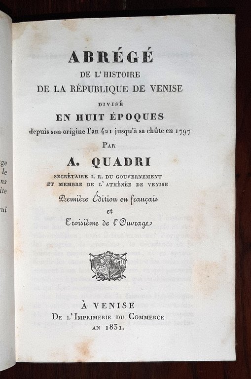 Abre?ge? de l'histoire de la re?publique de Venise divise? en huit e?poques depuis son origine l'an 421 jusqu'a sa chu?te en 1797. | Livres anciens et modernes | Quadri, Antonio