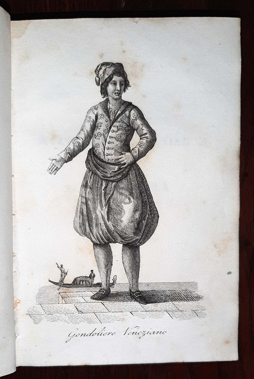 in-12°, 144x96 mm, leg. in mezza pelle e carta marmorizzata, titoli in oro al dorso; pp. 482, [9] tav. f.t. (incisioni di personaggi veneziani in costume d'epoca, rilegate prima dell'occhietto e del frontespizio); occhietto con titolo "Huit jours a Venise par A. Quadri - Seconde partie". Prima edizione in francese di questa seconda parte dell'opera "Huit jours a Venise" del Quadri, illustrata con 9 belle incisioni di costumi veneziani. Rif.: IT\ICCU\TO0\0849230. OCLC, 924352088. Cond.: Tracce d'uso alla legatura, con leggere abrasioni alle carte dei piatti. Presenza occasionale di fioriture. Esemplare in condizioni generali decisamente molto buone. -- FIRST FRENCH EDITION OF THIS SECOND PART OF QUADRI'S WORK "HUIT JOURS A VENISE", illustrated with 9 beautiful engravings of Venetian costumes. Copy in quite good condition.