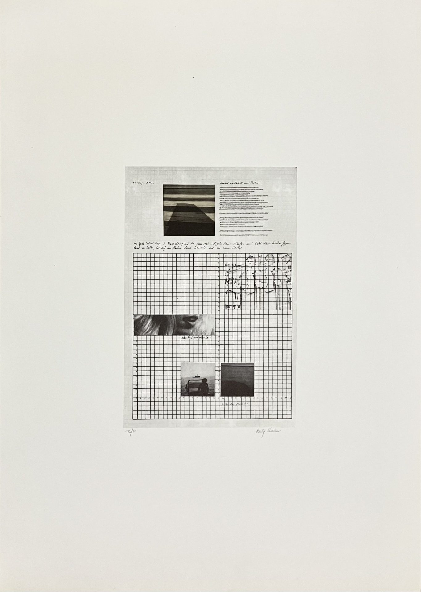 Stampa in b/n firmata a matita dall'artista, esemplare No. 12/30, opera di poesia visiva che integra testi manoscritti in tedesco, disegni e fotografie, in ottimo stato.