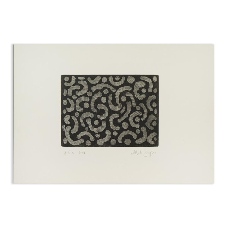 Composizione Astratta (2001) Incisione originale eseguita con tecnica a acquaforte e acquatinta su carta di ampio formato. L'opera presenta una fitta trama di forme organiche e curvilinee che emergono da un fondo scuro e uniforme, creando un contrasto netto e un dinamismo visivo astratto. Artista: Non identificato firmato a matita in basso a destraData: 2001 (datato a matita)Dimensioni Foglio: 50 x 35 cmDimensioni Lastra: 24 x 18 cmStato di conservazione: Ottimo