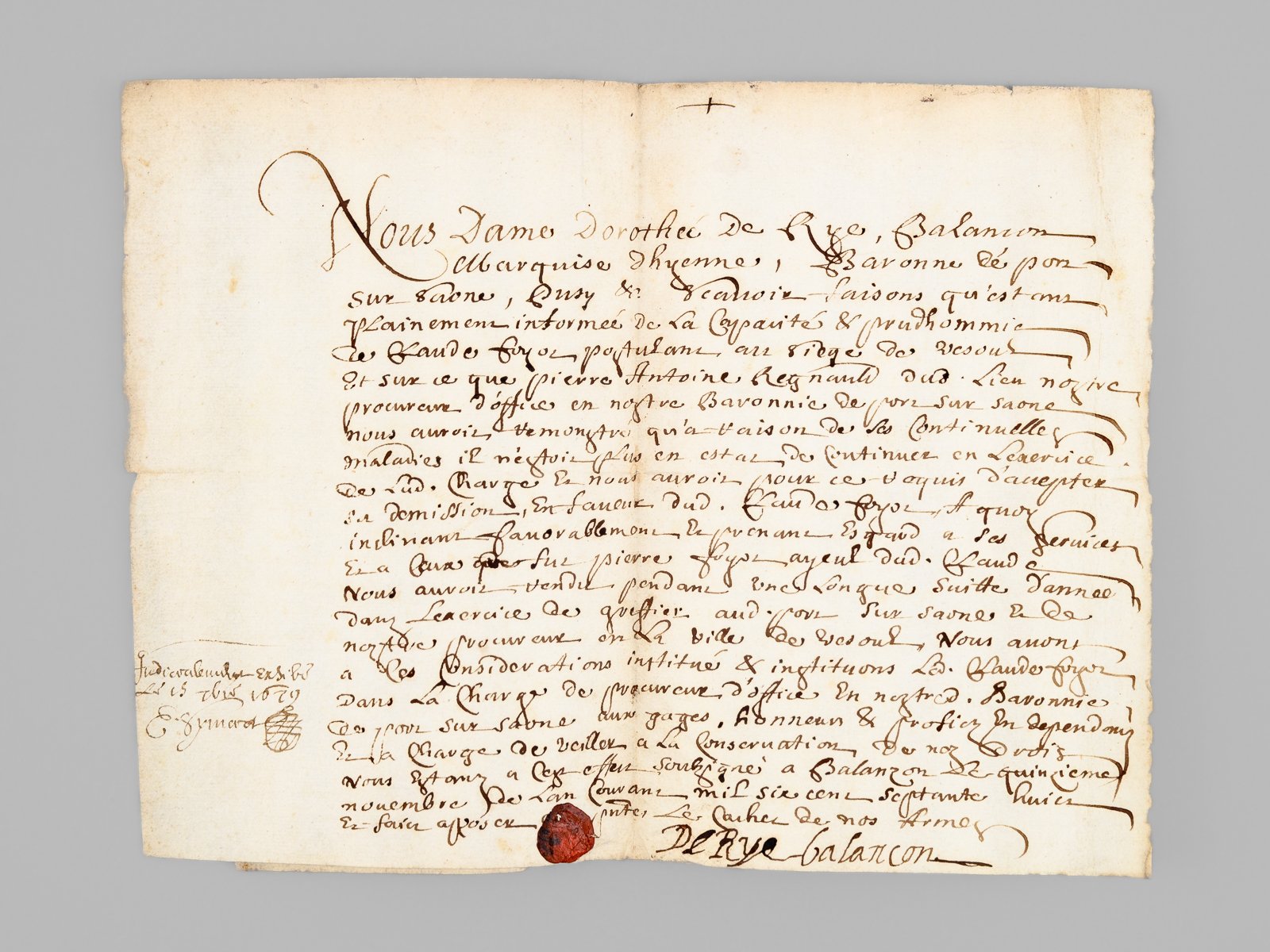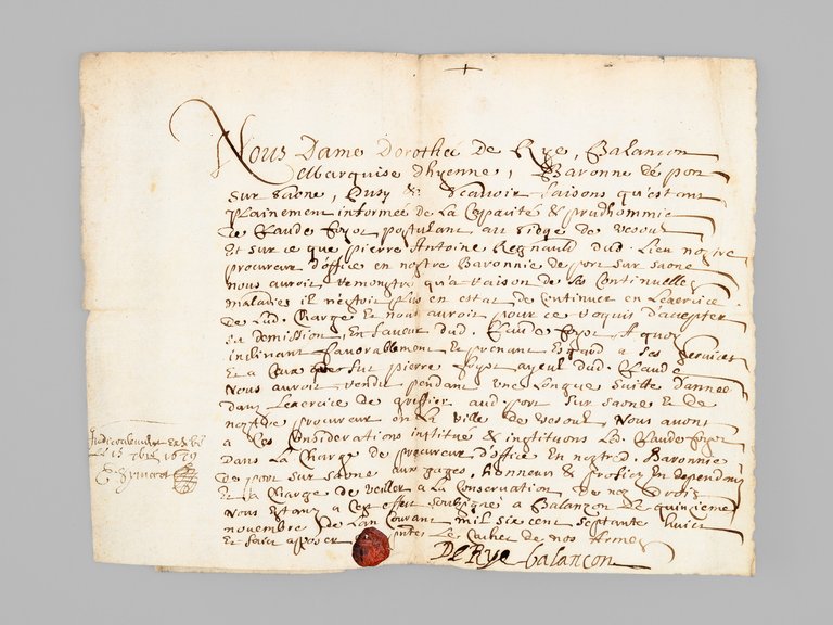 1 pièce de 2 ff., datée de 1678 (et 1679) : Acte de nomination daté de 1678, signé par Dorothee De Rye, Marquise d’Hyenne, Baronne de Port-sur-Saône : nomination de Claude Fyot comme procureur pour la baronnie de Balançon, en remplacement de Pierre Antoine Regnault : "Scavoir faisons qu’estans plainement informée de la capacité & prudhommie de Claude Fyot postulant au siege de Recous Et sur ce que Pierre Antoine Regnault dit Lieu nostre procureur d’office en nostre Baronnie de Port-sur-Saône nous auroit remontré qu’à raison de ses continuelle maladies il n’estait plus en estat de continuer en l’exercice de lad. Charge & nous auroit pour cet effect d’accepter sa Demission, En faveur dud. Claude Fyot, A quoy inclinant favorablement [. ] Nous avons a ces Considerations institué & instituons led. Claude Fyot Dans la Charge de Procureur d’office en nostre Baronnie de Port-sur-Saône Aux gages, Honneurs & profits en dependans Et la Charge de veiller a la conservation de nos droits. Nous estant a cet effect soussigné a Balançon Le quinzième novembre De l’an courans mil six cens septante huit & faure apposer [. ] le cachet de nos Armes." Dorothée de Rye était l'épouse de Philippe de la Baume, marquis d'Hyenne, baron du Perrenot, seigneur de Beaujeu, Saint-Loup, Autrey . Joli document, signé par la marquise d'Hyenne, et portant son cachet.