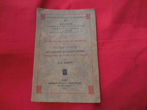 Paris, Hermann & Cie, Éditeurs, 1937; grand in-8, 26 pp., broché. Biologie (rayonnements, facteurs chimiques et physiques), exposés publiés sous la direction de G. A. Nadson, membre de l'Académie des Sciences de l'U. R. S. S.
