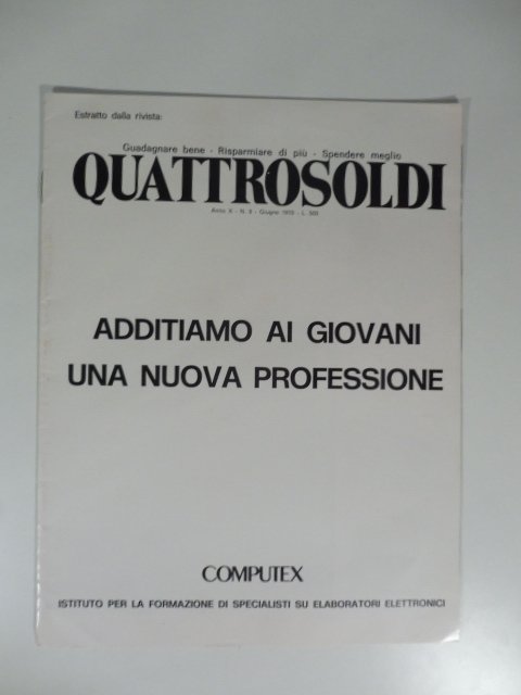 In 8 (cm 21 x 27), pp. (8) comprese le copertine. Brossura editoriale. Estratto dalla Rivista Quattrosoldi. Guadagnare bene, risparmiare di piu', spendere meglio. Articolo a cura della Computex, istituto per la formazione di specialisti su elaboratori elettronici che, agli albori della diffusione del computer, organizzava corsi per la formazione di addetti nel settore elettronico.