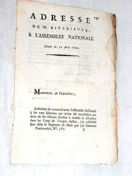 in-8. 2pp. Broché. Non rogné. Petites mouillures dans la marge. Dans le contexte tumultueux de la Révolution française, un discours prononcé à l'Assemblée Nationale le 21 août 1790 par le responsable du régiment de Metz émerge comme un document d'importance pour comprendre les réformes militaires de l'époque. Imprimé la même année par l'Imprimerie Nationale, ce texte offre un aperçu des préoccupations relatives à la discipline militaire dans une période marquée par des changements radicaux et des défis sans précédent. L'auteur, en sa qualité de militaire en poste en Lorraine, apporte une perspective unique sur l'impact de la Révolution au sein de l'armée, illustrant les tensions et les aspirations d'une France en pleine mutation.