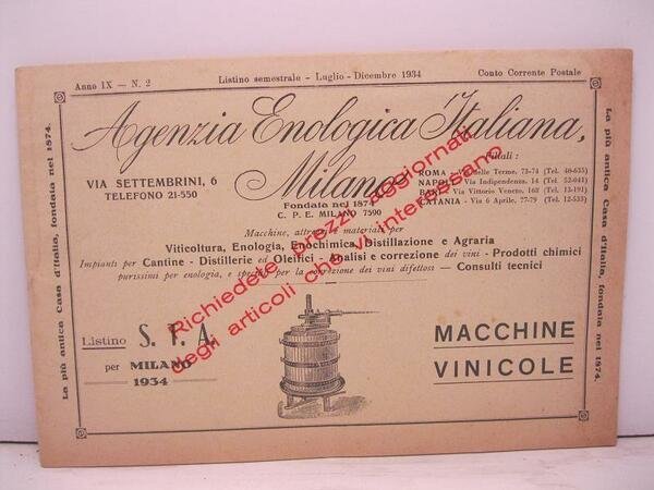 Agenzia enologica italiana, Milano, anno IX, n. 2, listino semestrale, luglio-dicembre 1934. Macchine vinicole