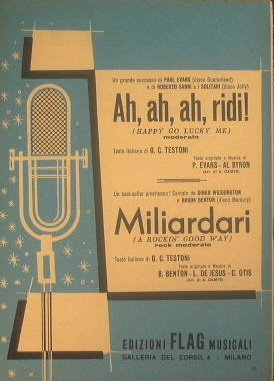 Happy go lucky me - A rockin good way - Autori: Testoni G. C., Evans P., Byron Al, Benton B., De Jesus L. E Otis C. - Un grande successo di Paul Evans, Roberto Sanni e i Solitari - Cantato da Dinah Wahington e Brook Benton - in 8° - pp.13 - Brossura editoriale illustrata - Partitura per Pianoforte, Strumenti in Do, Strumenti in Si b, Saxofono Contralto e Contrabbasso/Chitarra