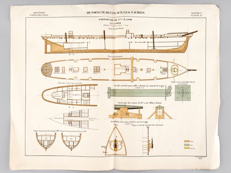 Aide-Mémoire d'Artillerie Navale. Planches. 2e Livraison 1879 (Chapitre VI : Renseignements sur les navires) : Planche 36 : Croiseurs de 3ème Classe. Le Limier. Coupe longitudinale, Plan des Gaillards, Plan des soutes aux poudres, Cheville ouvrière pour affût à châssis du canon de la teugue, Amarrage et installation des canons de 14 c/m