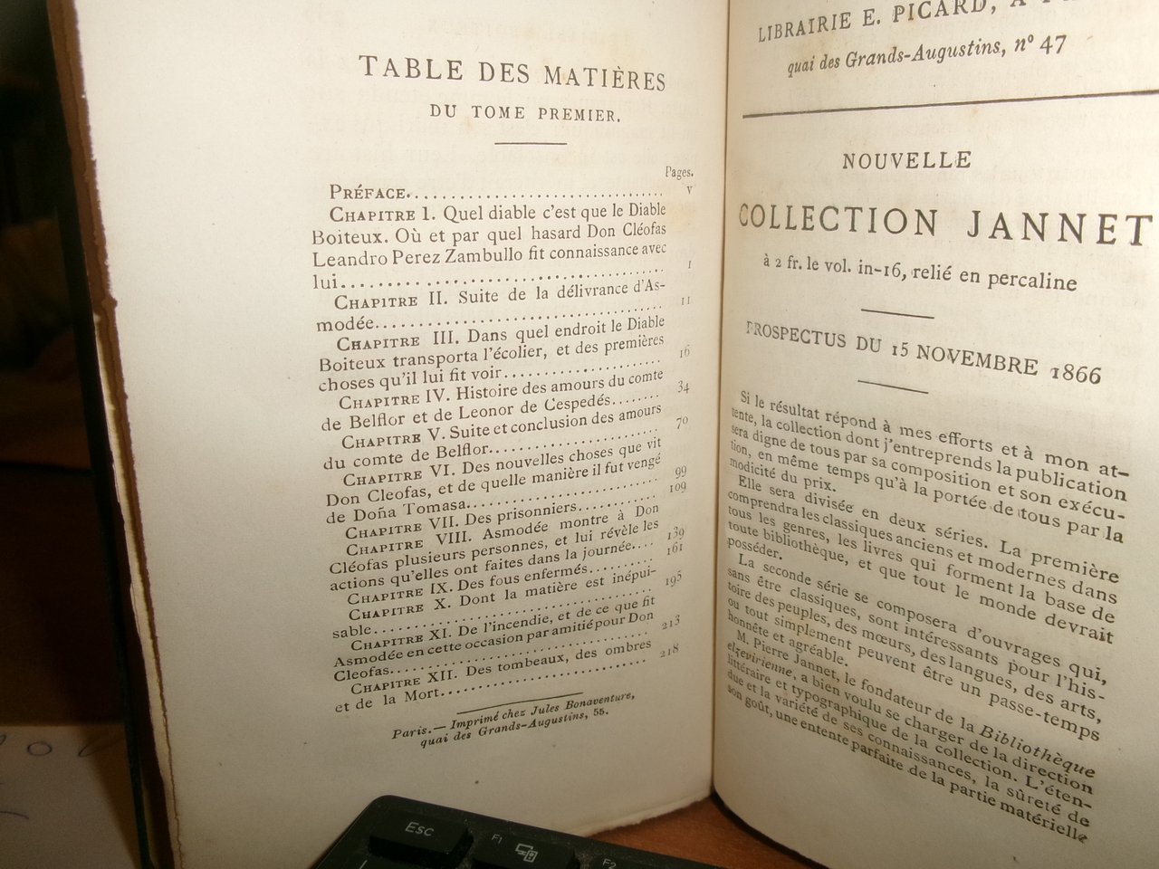 Alain René Le Sage. LE DIABLE BOITEUX. Solo volume I. Paris, Chez E. Picard, MDCCCLXVII. In-16°, tela d' epoca con titolo dorato al dorso e sul piano anteriore. xvi, 235, (5) pp. Ben conservato con pagine leggermente e irregolarmente brunite con testo in francese. Neg. esot. mob. 60 in busta trasp.