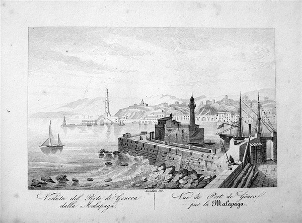 in-16 obl. (mm. 130x189], leg. cartone edit. Rara raccolta di 14 belle vedute della città di Genova, inc. in rame da Metello, Gandini, Bonatti, protette dalle veline orig. Con altre tavv. xilogr. aggiunte. Bell'esempl. [MM2-161]