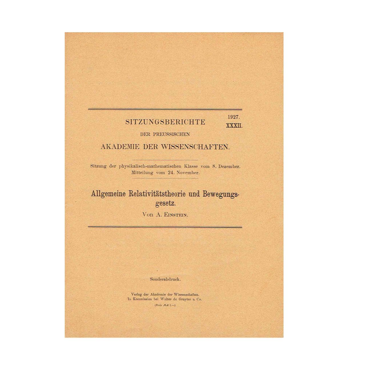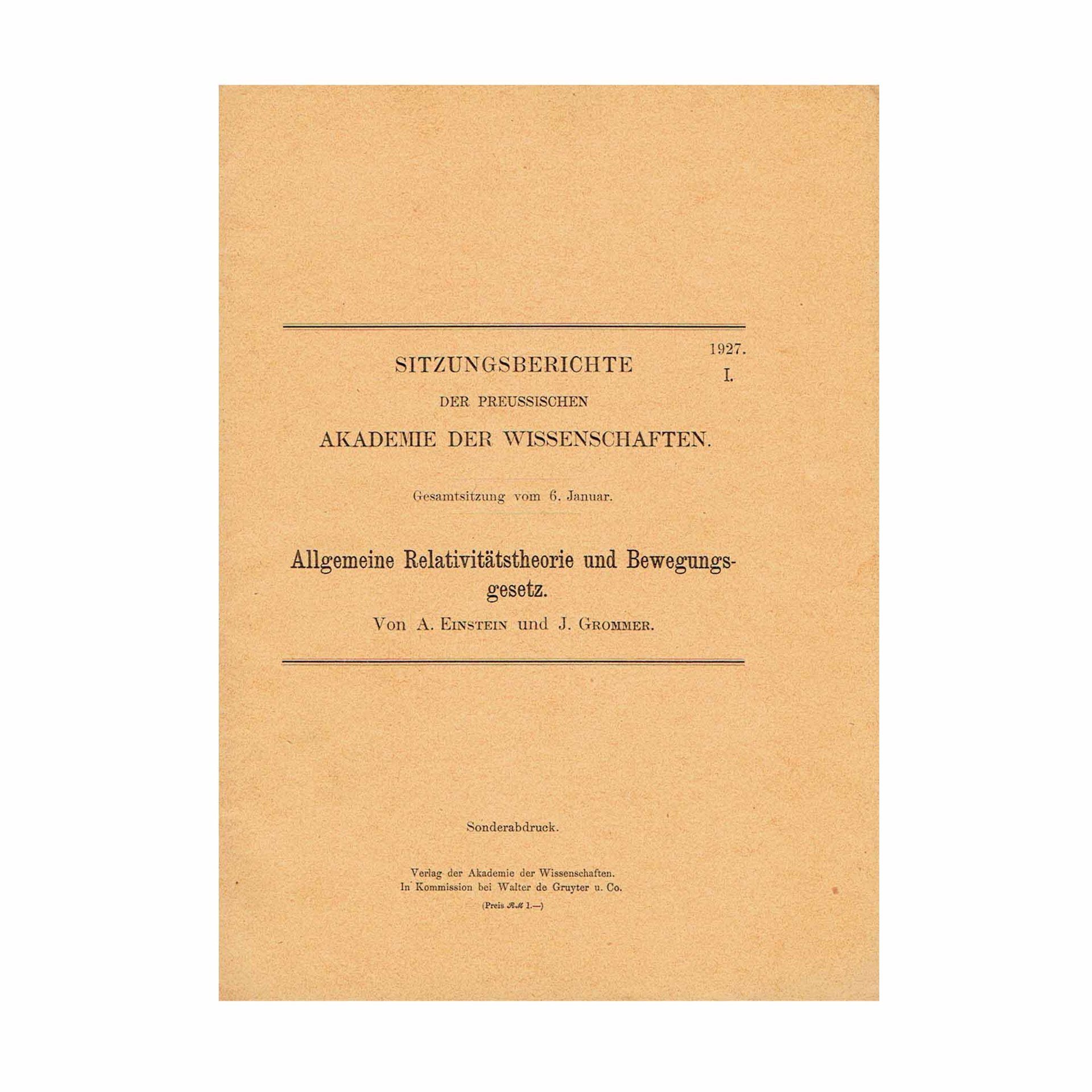 ALLGEMEINE RELATIVITÄTSTHEORIE UND BEWEGUNGSGESETZ. [General Theory of Relativity and the Law of Motion.] 2 issues. Sitzungsberichte der Preussischen Akademie der Wissenschaften, I (1927). Gesamtsitzung vom 6. Januar. AND: Sitzungsberichte der Preussischen Akademie der Wissenschaften, XXXII (1927). Sitzung der physikalisch-mathematischen Klasse vom 8. Dezember. Mitteilung vom 24. November. 2 Sonderabdrucke [2 Offprints]).