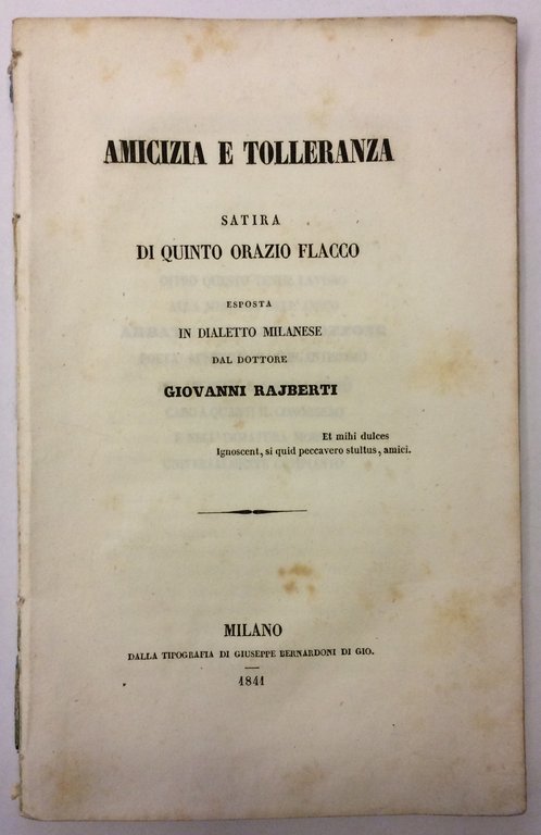 AMICIZIA E TOLLERANZA. - Satira di Quinto Orazio Flacco esposta in dialetto milanese dal Dottore Giovanni Rajberti.