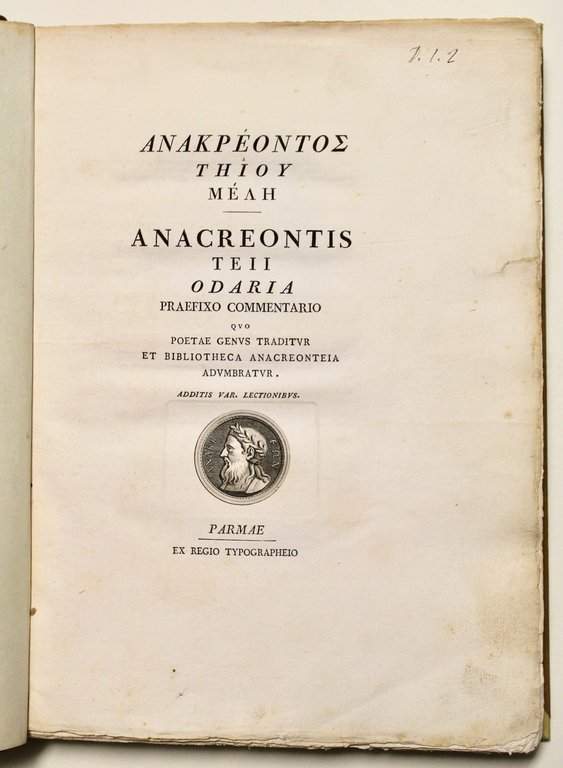 Anacreontis Teii Odaria praefixo commentario quo poetae genus traditur. (testo greco e latino).