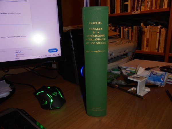 CAMPBELL. M.E. KRONENBERG. La Haye, Martinus Nijhoff, Ongewijzigde herdruk, 1962. The Hague Martinus Nijhoff, 1956 ANNALES de la TYPOGRAPHIE Néerlandaise au XV Siècle avec les suppléments. 2 volumi in-8°, tela edit. in tela verde (legature difforme) con titoli in oro sul piano e al dorso. Vol. I. XII, [6], 630, V, 30, VII, 44, IV, 29, VI, 5 pp. Vol. II. 168 pp. Come nuovi. Uff. E - I - 6