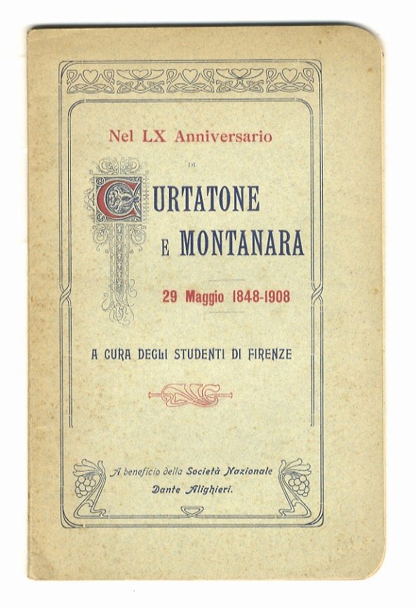 Anniversario (Nel LX) di Curtatone e Montanara. 29 Maggio 1848-1908. A cura degli Studenti di Firenze. (Testi di: C. Del Lungo, G. Rondoni, Jack la Bolina alias A. V. Vecchi, Vamba alias L. Bertelli, C. Rossi, G. Bonomelli, R. Fucini, A. Fogazzaro, L. Capuana, D. Zanichelli, A. Eccher, ecc. - Lettere dall'epistolario di Lodovico e Morello Morelli Bartolommei - Ricordo del veterano Natale Marchettini).
