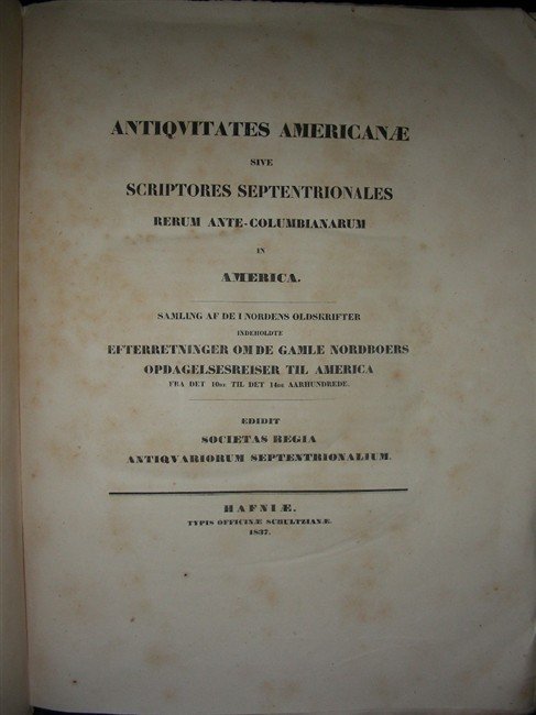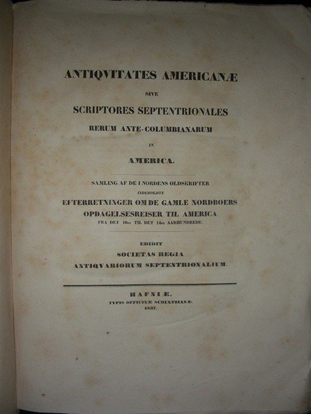 gr. vol. in folio, pp. XLII, 479, (6), leg. carta color. coeva con dorso con tit. a stampa. Con 19 tavv. raff. pagine di antichi codici, vedute, tra cui una gr. mappa su due fogli dell'Islanda, altra ripiegata delle regioni artiche americane. Testo in lingua latina e danese. Il secondo frontespizio recita: "Antiquitates Americanae, sive Scriptores septentrionales rerum Ante-Columbianarum in America". Ediz. orig. Scopo della corposa pubblicazione era di dimostrare come negli incunaboli e documenti scandinavi ci fossero tracce della conoscenza del Nuovo Continente da parte delle popolazioni nordiche, in epoca di gran lunga antecedente la scoperta di Colombo. Bruniture nel testo e fioriture marginali alle tavv. protette da veline, dovute alla qualità della carta. [126]
