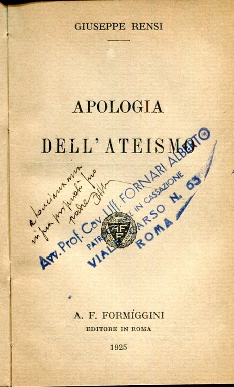 In 16, pp. 105. Legatura mezza tela con titoli in rosso. Lievi bruniture alle carte. Timbro di possesso e dedica anonima Buono (Good) .