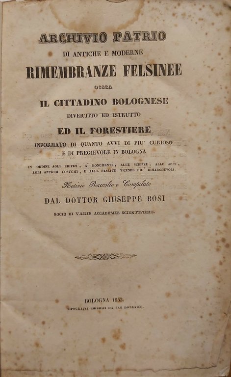 ARCHIVIO PATRIO di antiche e moderne rimembranze felsinee ossia Il Cittadino Bolognese divertito ed istrutto ed il Forestiere informato di quanto avvi di più curioso e di pregievole in Bologna, in ordine agli edifizi, a' monumenti, alle scienze, alle arti, agli antichi costumi, e alle passate vicende più rimarchevoli.