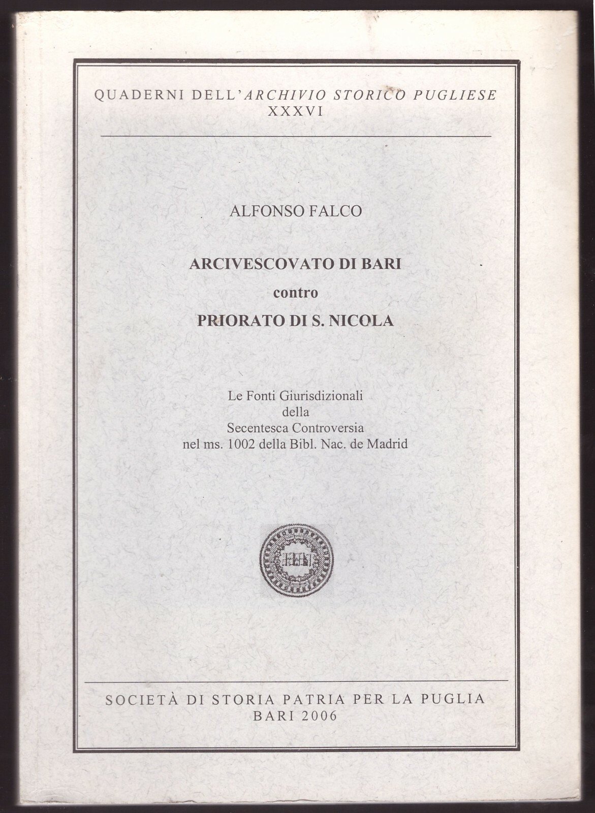 ARCIVESCOVATO DI BARI CONTRO PRIORATO DI SAN NICOLA di Alfonso Falco 2006 Libro