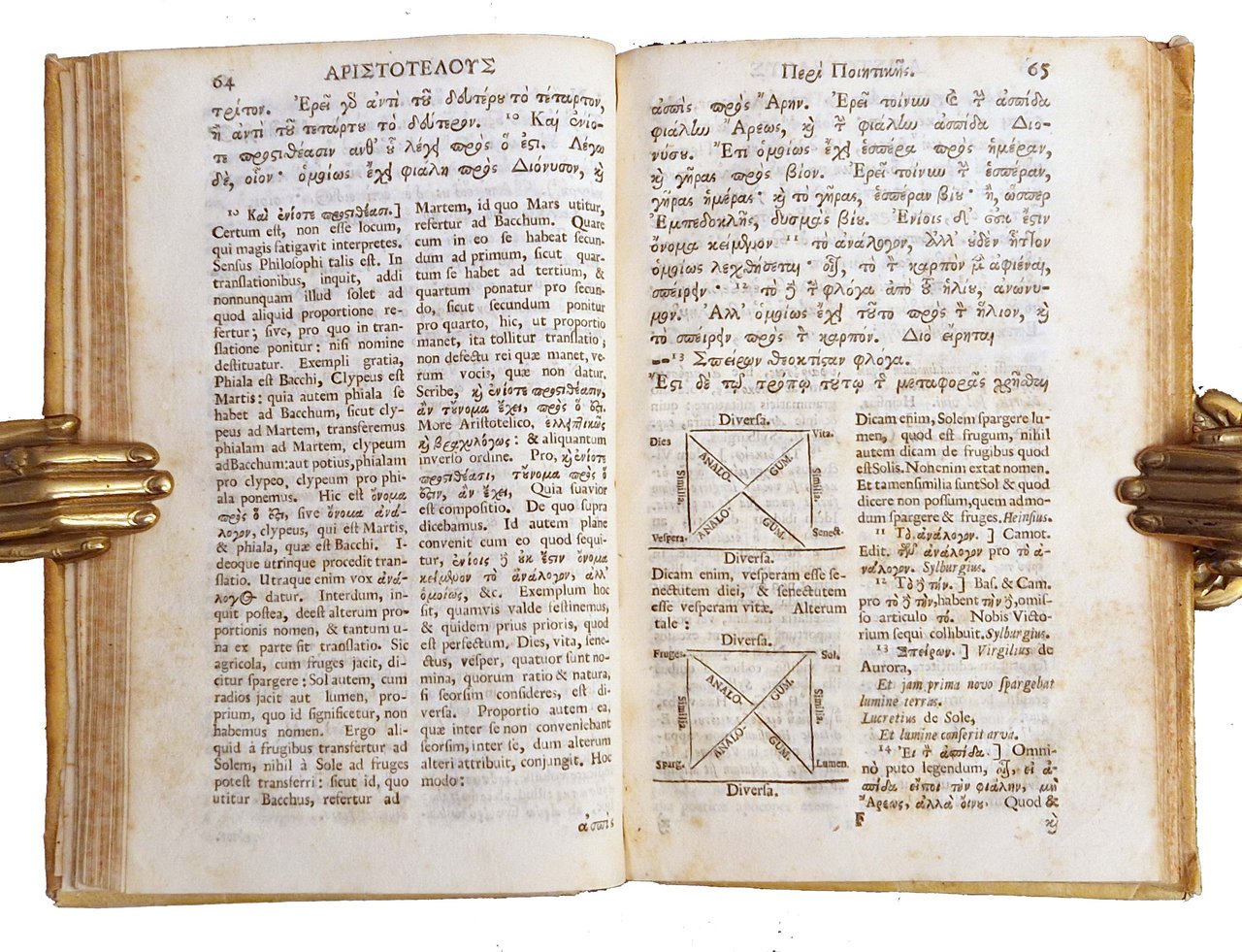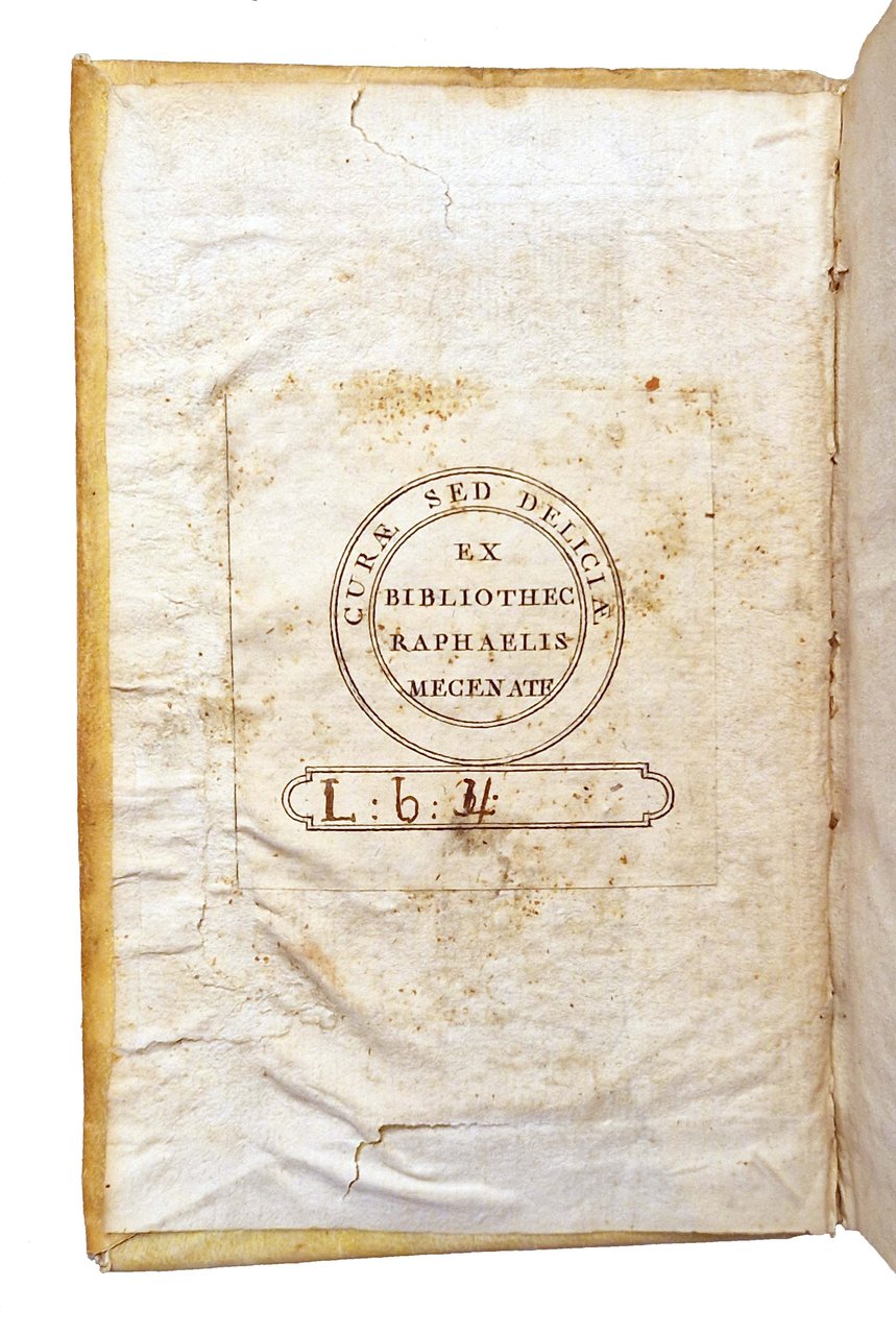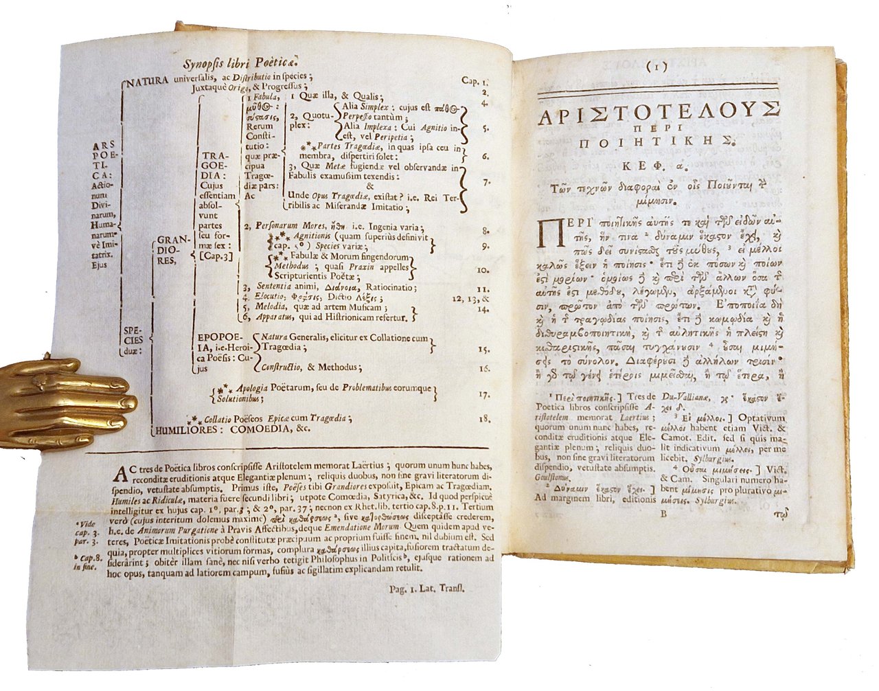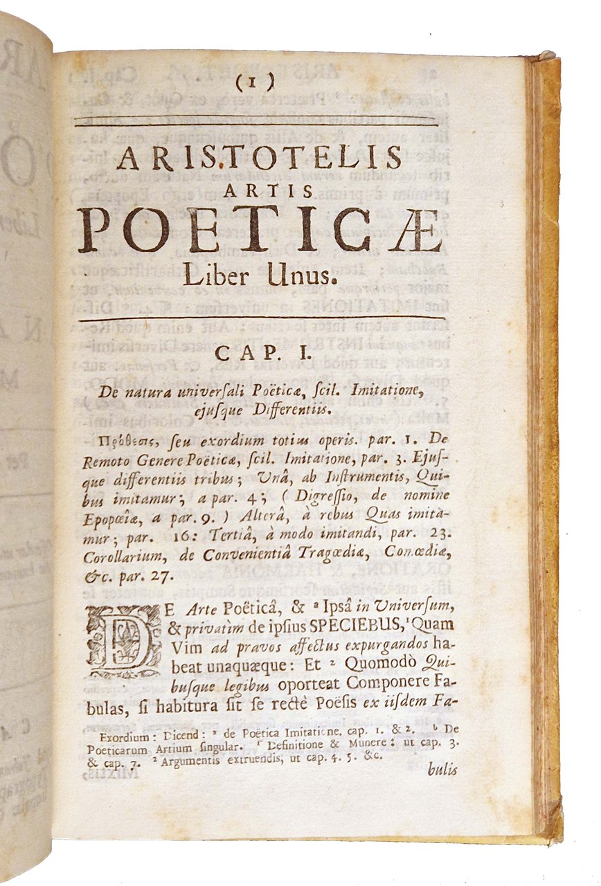 in-8°, 170x108 mm, leg. coeva rigida in piena pergamena, con dorso a cinque nervi, titolo manoscritto al dorso, etichetta cartacea di biblioteca privata incollata al dorso, tagli colorati di rosso a spruzzo; pp. [20], 101, [3], 104, [12], [1] c. di tav. Opera composta da due parti, ognuna preceduta da proprio frontespizio; il titolo della seconda parte è "Aristotelis De poetica liber, Latine conversus, et analytica methodo illustratus. Per Theodorum Goulstonum". Nella prima parte del volume, preceduta da una tavola più volte ripiegata con la sinossi dei libri De poetica, è riportato il testo in greco con note in latino, mentre nella seconda parte il testo è in latino. Dodicesima edizione (la prima fu pubblicata nel 1623) di quest'opera di Aristotele nella traduzione di Theodore Goulston (1572-1632), medico inglese, studioso e fondatore delle Goulstonian Lectures; era figlio di William Goulston, rettore di Wymondham, Leicestershire. Prov.: Etichetta di appartenenza incollata al contropiatto anteriore con ex-libris di Raffaele Mecenate (Ex bibliothec Raphaelis Mecenate - Curae sed deliciae). Raffaele Mecenate fu un giureconsulto, vissuto ai primi del 1800. Rif.: IT\ICCU\PUVE\023359. OCLC, 1120804168. Cond.: Legatura e carte interne in condizioni decisamente molto buone.