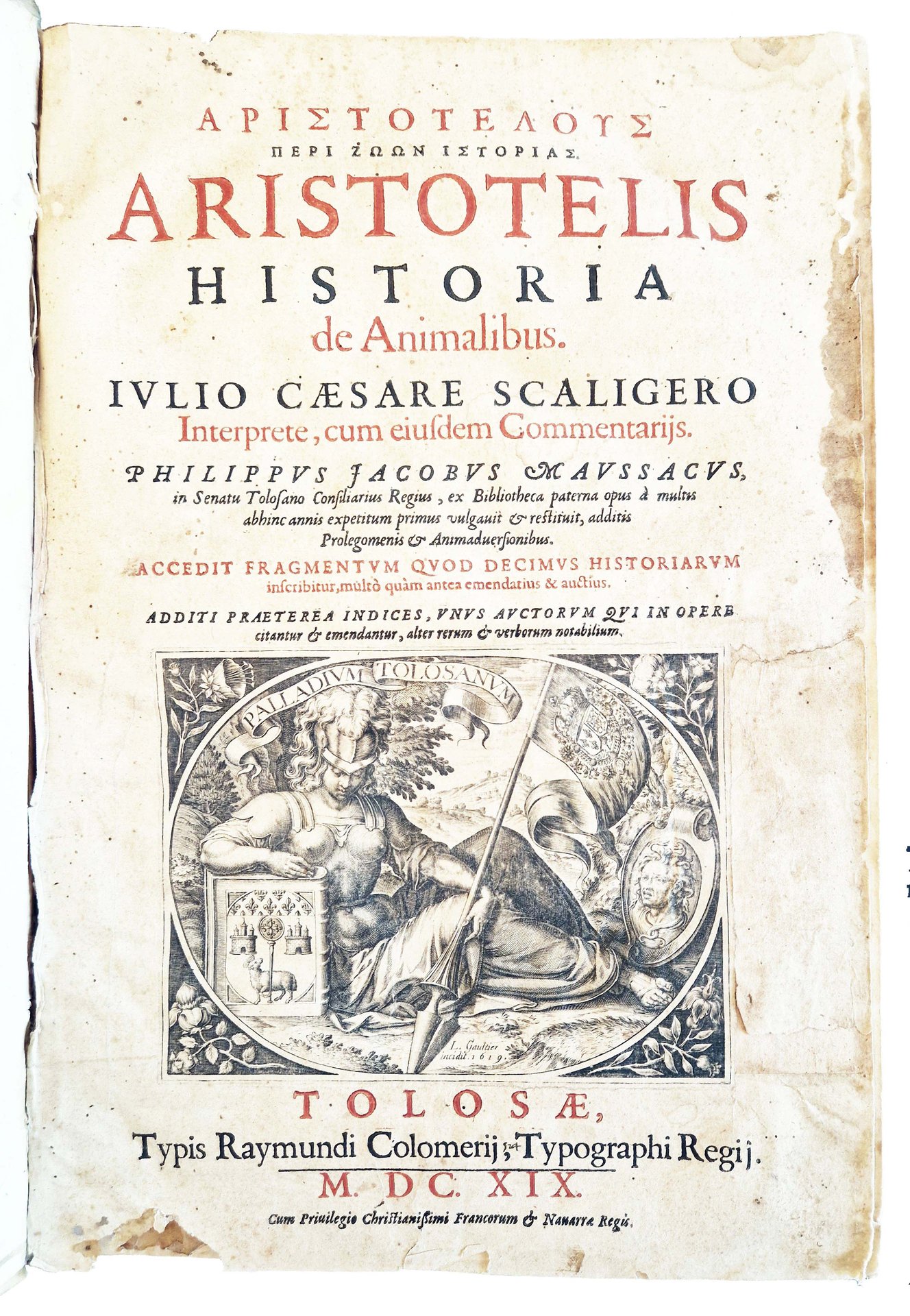 Aristotelous Peri zoon istorias. Aristotelis Historia de animalibus. Iulio Caesare Scaligero interprete, cum eiusdem commentarijs. Philippus Jacobus Maussacus, in senatu Tolosano consiliarius regius, ex bibliotheca paterna opus a multis abhinc annis expetitum primus vulgauit & restituit, additis prolegomenis & animaduersionibus. Accedit fragmentum quod decimus historiarum inscribitur, multo quam antea emendatius & auctius. Additi praeterea indices, vnus auctorum qui in opere citantur & emendantur, alter rerum & verborum notabilium. | Livres anciens et modernes | Aristoteles