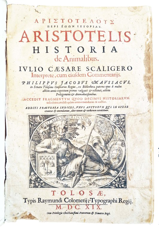 Aristotelous Peri zoon istorias. Aristotelis Historia de animalibus. Iulio Caesare Scaligero interprete, cum eiusdem commentarijs. Philippus Jacobus Maussacus, in senatu Tolosano consiliarius regius, ex bibliotheca paterna opus a multis abhinc annis expetitum primus vulgauit & restituit, additis prolegomenis & animaduersionibus. Accedit fragmentum quod decimus historiarum inscribitur, multo quam antea emendatius & auctius. Additi praeterea indices, vnus auctorum qui in opere citantur & emendantur, alter rerum & verborum notabilium.