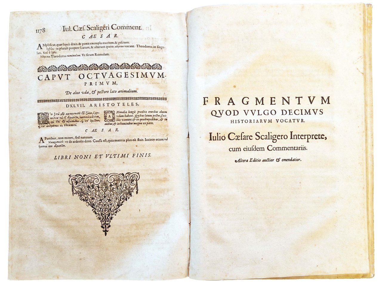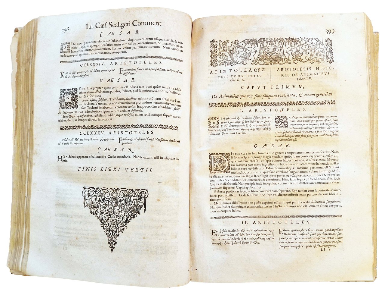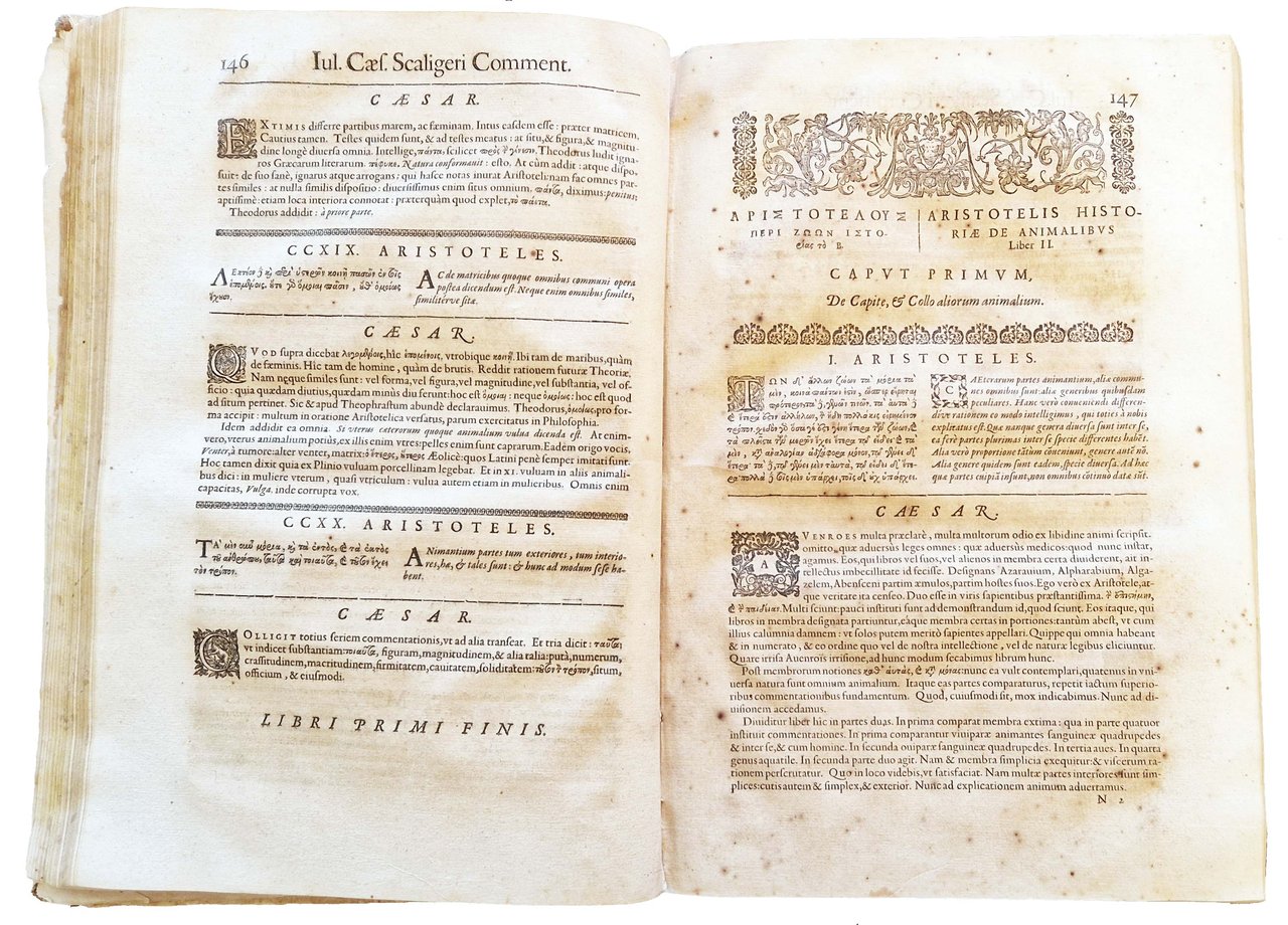 in-folio, 352x236 mm, leg. coeva in piena pergamena, con titolo a caratteri dorati (sbiaditi) su tassello al dorso liscio, tagli leggermente colorati di giallo (sbiadito); pp. [32], 1248, [24]. Testo in greco e latino, con commento in latino. Grande marca xilografica (allegoria della citta di Tolosa incisa da L. Gaultier) sul frontespizio. Frontespizio stampato in rosso e nero. Prima edizione di quest'opera di Aristotele (filosofo greco nato a Stagira nel 384 a.C. e morto a Calcide nell'Eubea nel 322 a. C.), a cura e con commento dello Scaligero, uno dei più celebri polemisti del Rinascimento, pubblicata postuma sotto la direzione dell'eccellente ellenista P. J Maussac che fornì una traduzione latina e alcune note per accompagnare gli estratti di Aristotele in greco e il lungo commenti di Scaligero. Giulio Cesare Scaligero (1484-1558), filosofo e un uomo di scienza, considerava gli studi classici come un mezzo di relax; i suoi scritti scientifici sono tutti sotto forma di commenti. Nel 1556 stampò il suo dialogo sul "De plantis" attribuito ad Aristotele; i suoi commenti sulla "Storia degli animali" di Aristotele, li lasciò in uno stato più o meno incompiuto e furono stampati solo dopo la sua morte. Rif.: IT\ICCU\NAPE\024824. OCLC, 797658870. Cond.: Segni d'uso alla legatura (presenza di macchie e abrasioni). Bruniture alle carte, tipiche di quel tipo di carta. Presenza di alcune macchie marginali e fioriture; occasionali gore d'umido alle ultime carte. Difetti al frontespizio (mancanza di una piccola porzione di carta al margine inferiore, antico restauro di rinforzo a margine della marca xil., macchia al margine esterno). Esemplare con i segni del tempo, ma in buone condizioni generali.