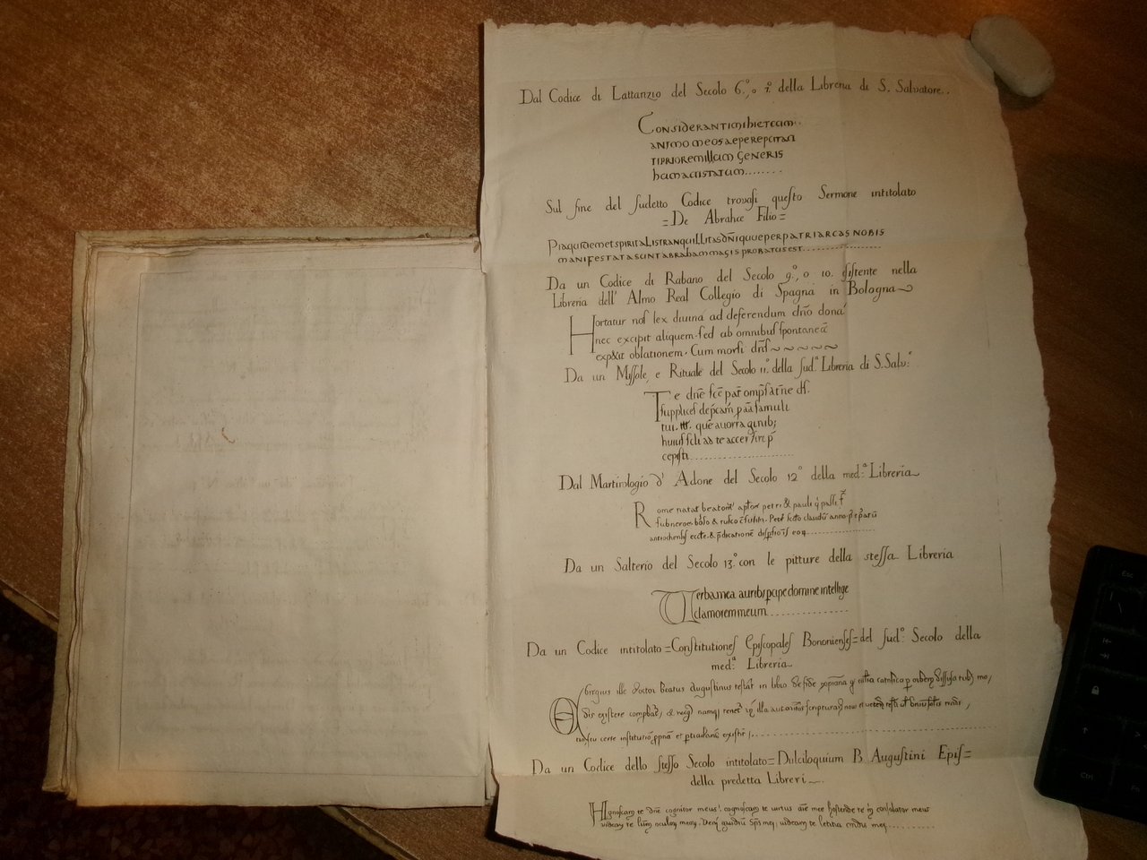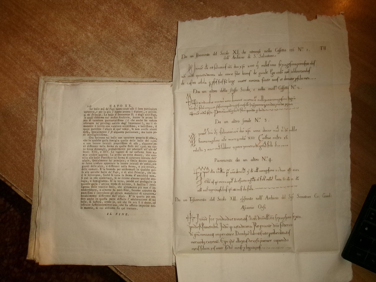 TROMBELLI, Giovanni Crisostomo (1697-1784). Bologna, G. Corciolani ed Eredi Colli a s. Tommaso d' Aquino, 1756. In-4°, cartonato officinale. xii, 116 pp. con facsimili n.t. e due tavole incise in rame ripiegate f.t. Frontespizio stampato in rosso e nero con vignetta al centro. Bell' esemplare intonso di quest' opera rara più volte ristampata. Ex Libris al verso. E' presente un manoscritto di mano coeva di 3 pp. scritto nelle prime due pagine e nell' ultima bianca. Edizione originale. Brunet, V, 967. Graesse, VII, p. 206. Neg. esot. mob. 72 entro busta trasp