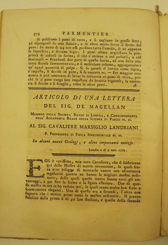 Articolo di una lettera del sig. De Magellan. al sig. cavaliere Marsiglio Landriani. su alcuni nuovi orologi e altre importanti notizie.